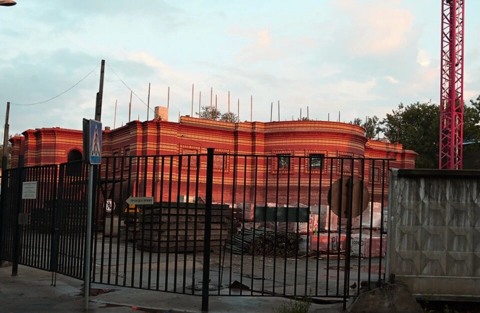 На представленной фотографии запечатлён исторический момент строительства Храма Вознесения Господня в городе Электросталь Московской области. Святыня возводится из красного кирпича в традиционном русском церковном стиле, с характерными арочными проёмами и основанием для будущих куполов. На переднем плане видны элементы благоустройства территории, включая ограждение и дорожные знаки, обеспечивающие безопасность прихожан и строителей.