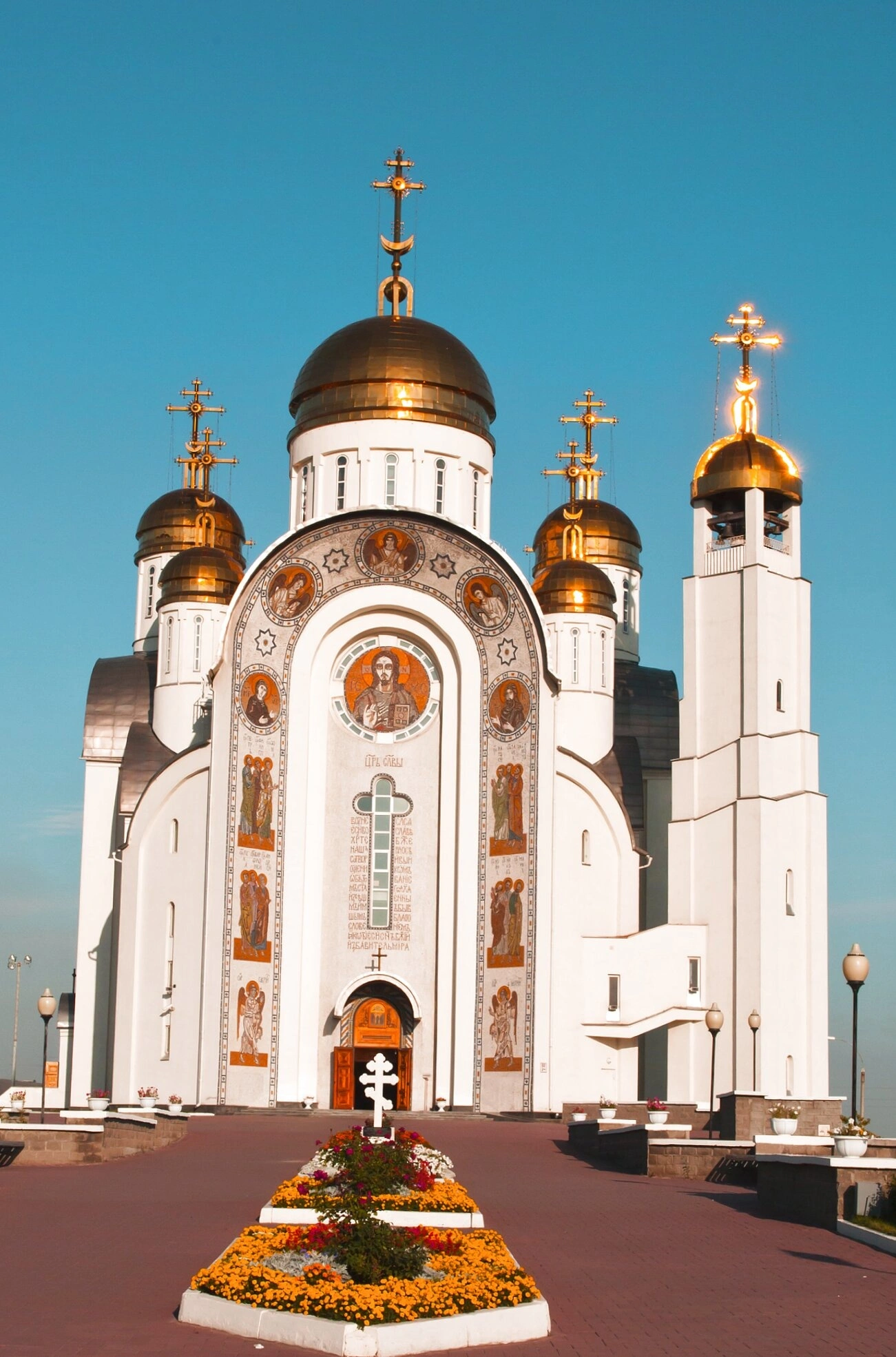 На представленной фотографии запечатлён величественный Храм Вознесения Господня, расположенный в городе Магнитогорске Челябинской области. Этот монументальный собор, возведённый в начале 2000-х годов, является одним из самых значительных православных сооружений, построенных в России в новейшее время, и духовным символом города-труженика.