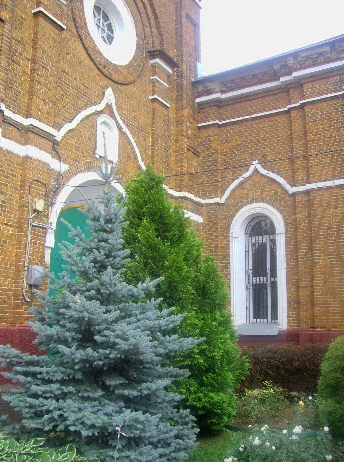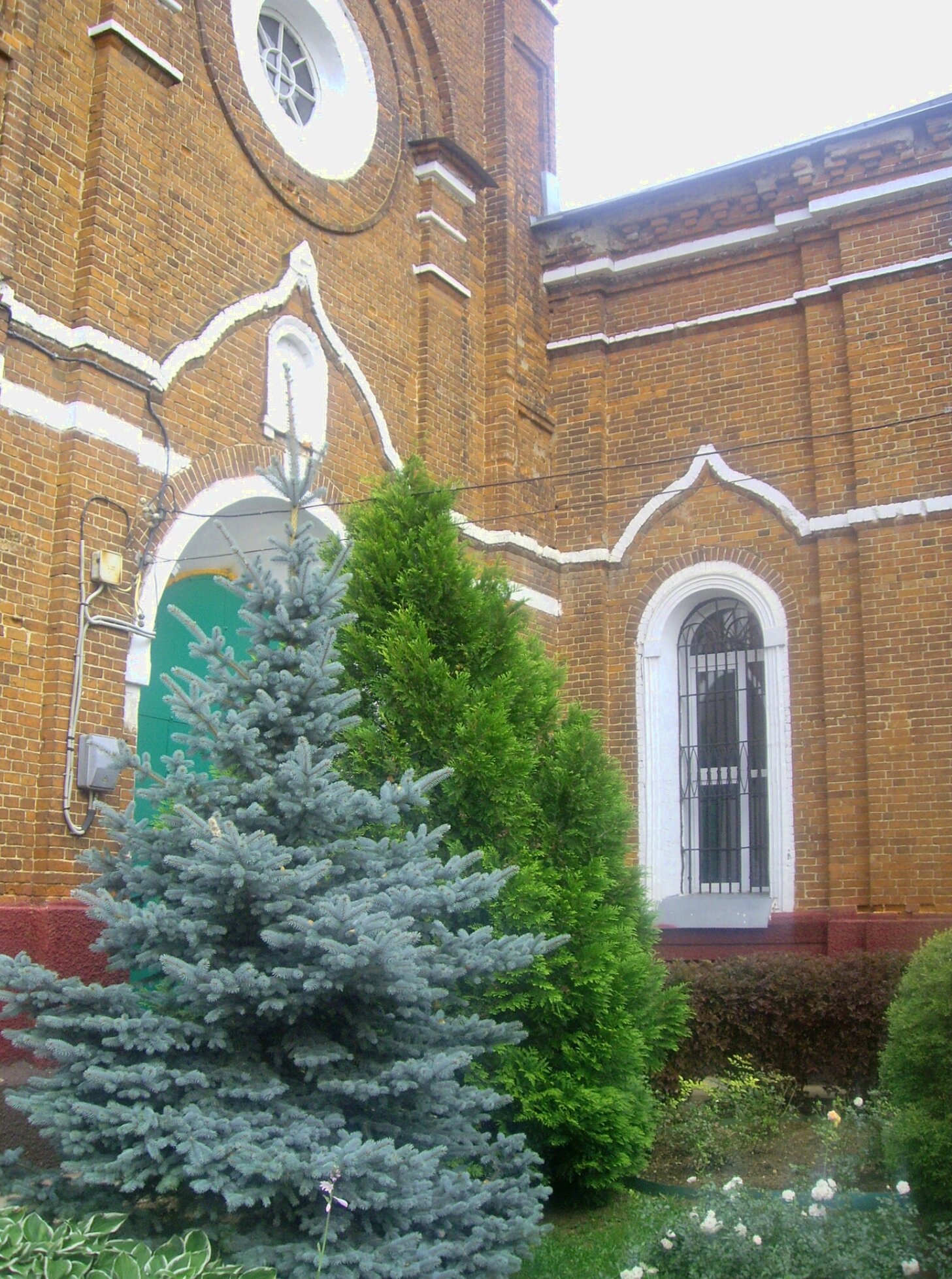 Храм Вознесения Господня в подмосковном селе Речицы является выдающимся образцом православной церковной архитектуры. Здание сооружено из красного кирпича с изящными белыми декоративными элементами, создающими гармоничный контраст. Фасад украшают арочные оконные и дверные проёмы, а также круглое окно в верхней части, характерное для традиционного русского зодчества. На переднем плане фотографии видны ухоженные хвойные и лиственные растения, включая голубую ель и туи, которые символизируют вечную жизнь и подчёркивают духовную значимость места.