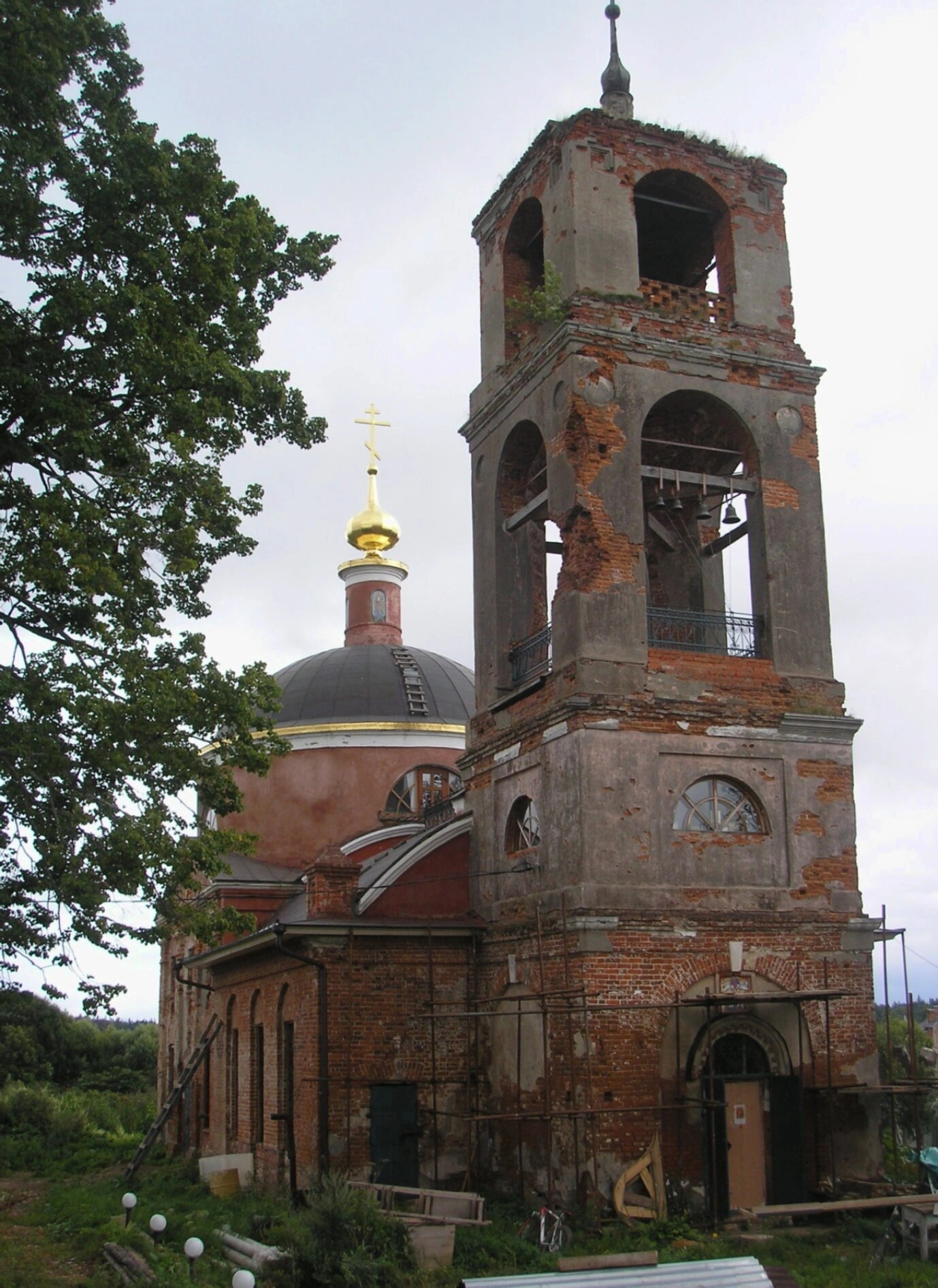 В годы гонений на Церковь храм, как и многие другие святыни России, был закрыт и подвергся разорению. Долгое время здание находилось в заброшенном состоянии, что привело к его значительному разрушению. На снимке видны следы ведущихся восстановительных работ: вокруг колокольни установлены строительные леса, что свидетельствует о начале возрождения этой древней святыни.