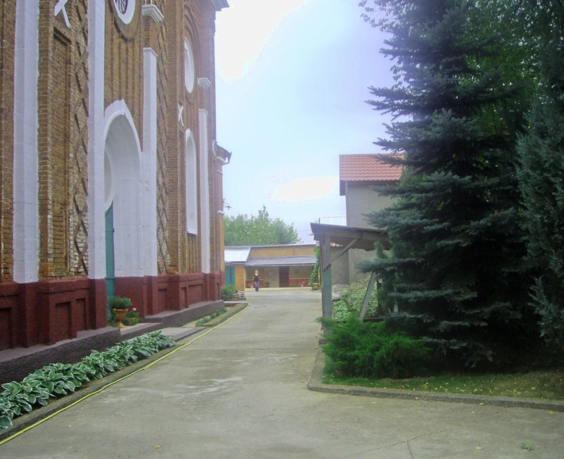 Неотъемлемой частью священного пространства является и окружающая природа: у подножия храма разбит цветник с растениями хосты, а с правой стороны кадра возвышается пушистое хвойное дерево, символически напоминая о вечной жизни. Ухоженная территория и проложенная вдали дорожка свидетельствуют о внимательном и бережном отношении к этому месту молитвы. На заднем плане виднеются другие строения церковной усадьбы и мирские постройки, что подчёркивает неразрывную связь духовной жизни с повседневным бытом.
