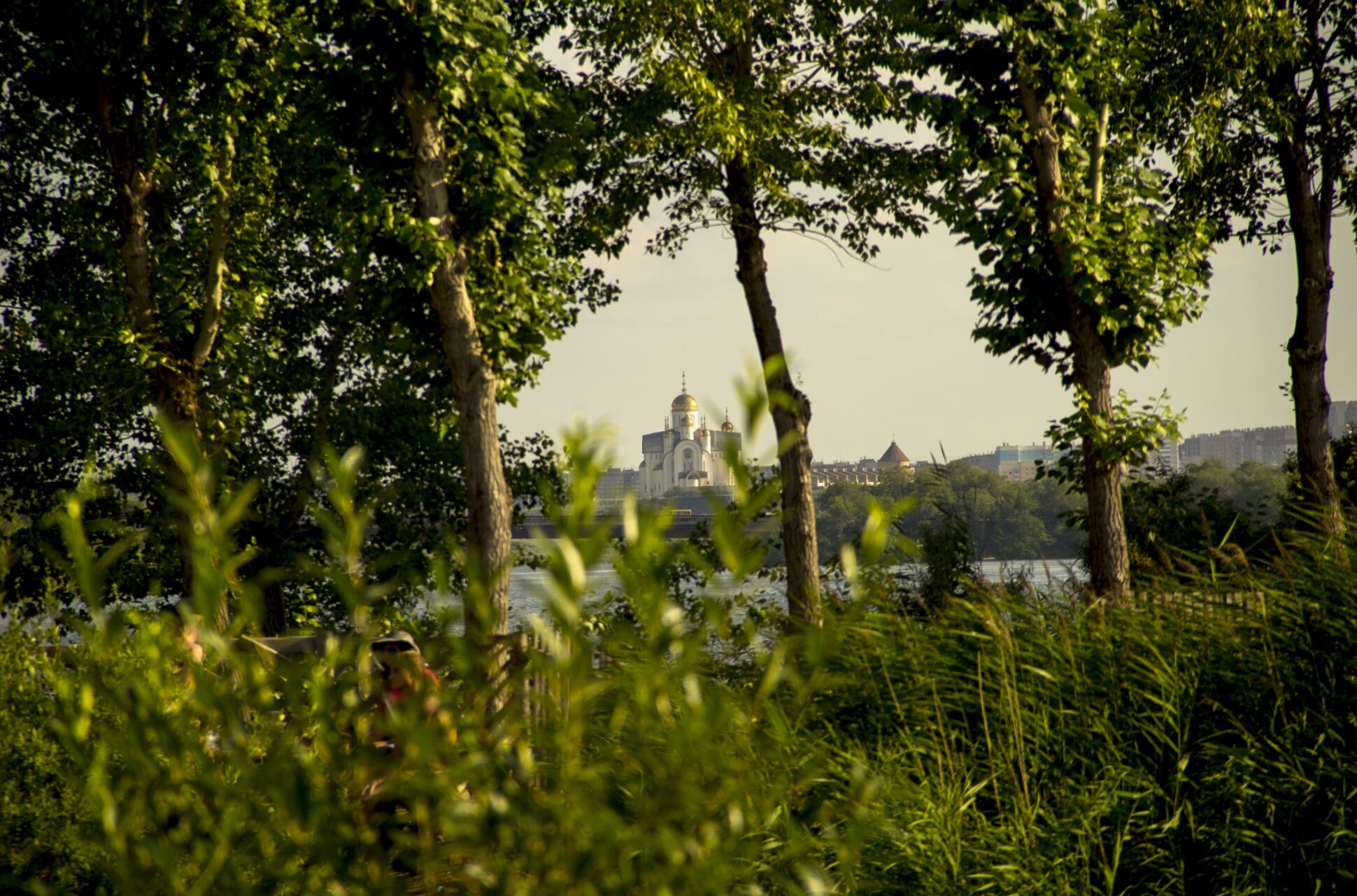 Передний план снимка погружает зрителя в природную среду: густая зелень деревьев и кустарников обрамляет вид на святыню, подчеркивая её величие и неразрывную связь с творением Божиим. Через ветви просматривается гладь реки Урал, разделяющей город на два континента — Европу и Азию. Водная стихия, спокойная и величавая, отражает небесную лазурь, добавляя пейзажу пространственную глубину и особый, благостный настрой.