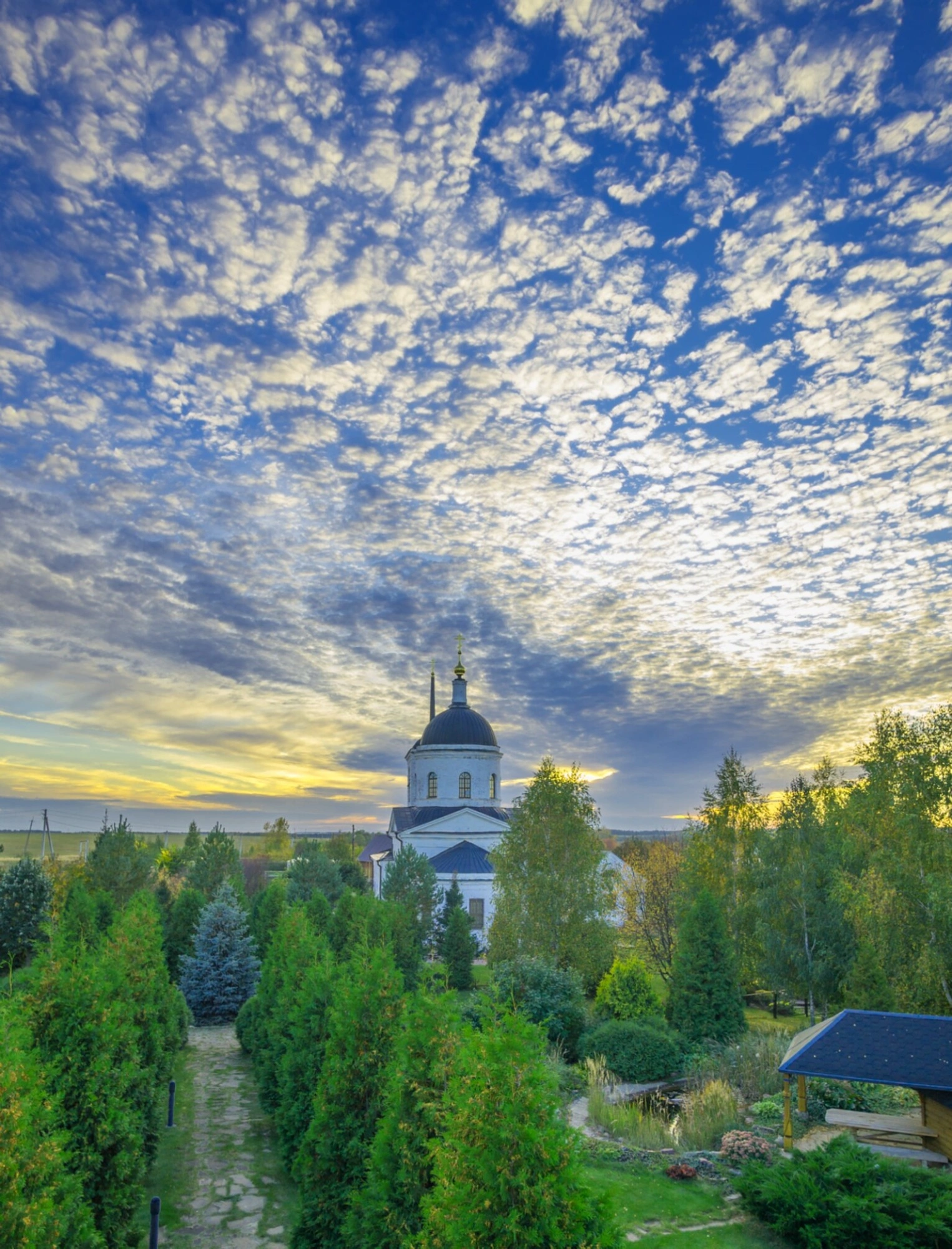 На заднем плане открывается безмятежный сельский пейзаж Нижегородчины — бескрайние поля и леса, утопающие в лёгкой дымке. Небо, окрашенное в мягкие тона заката, с пышными облаками, создаёт ощущение божественного присутствия и покоя, нисходящего на землю. Общая атмосфера фотографии передаёт тихую, созерцательную молитву, отрешение от суеты и гармонию божьего мира.