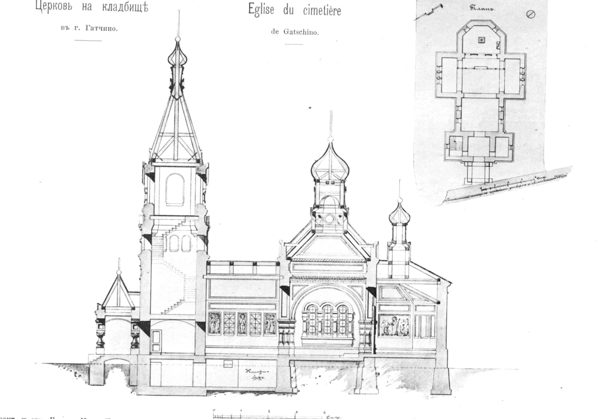 На представленной архитектурной гравюре запечатлён проект Храма Всех Святых, расположенного на городском кладбище Гатчины. Изображение демонстрирует боковой фасад священного сооружения с изящной колокольней и благолепными куполами, а в правом верхнем углу размещён детальный план церкви. Подпись на гравюре на русском и французском языках свидетельствует: «Проект и строительство гражданского инженера Н. Дмитриева». Фототипическое воспроизведение было выполнено в Санкт-Петербурге в типографии В.И. Штейна.