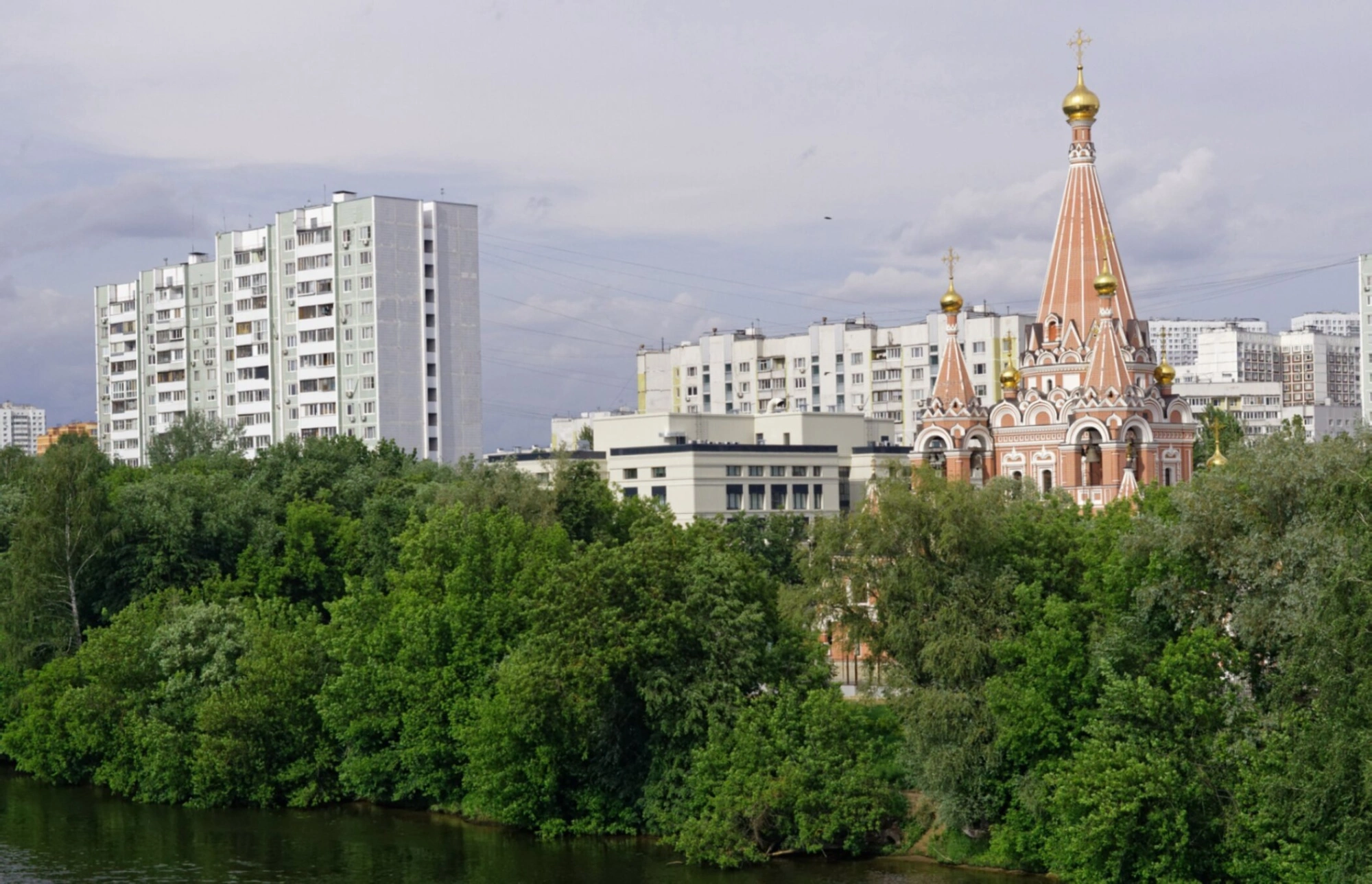 На представленной фотографии запечатлён современный православный Храм Всех Святых, расположенный в Филёвской пойме Москвы. Снимок демонстрирует величественный вид храма, который был возведён в начале XXI века как памятник жертвам войн и символ возрождения православной жизни в этом районе. Его строительство велось с 2007 по 2010 год на Филёвском бульваре, ознаменовав возвращение традиции церковного служения после долгого перерыва.