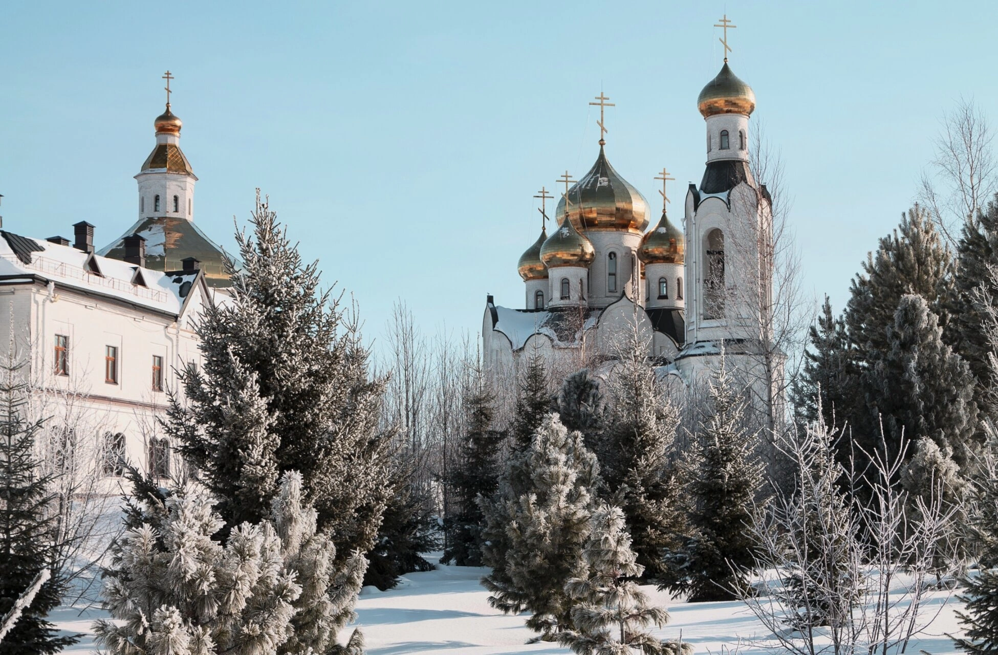 На представленной фотографии запечатлён храм в честь Всех Святых, что в граде Нефтеюганске, в благолепии зимнего убранства. Белоснежные стены церковного здания и сияющие на солнце златые главы с крестами мирно возносятся к высокому лазурному небу, являя собой светлый образ православной святыни в суровых сибирских краях. Вся земная твердь и ветви окружающих храм хвойных деревьев — елей и сосен — щедро укрыты пушистым снегом и искристым инеем, что создаёт ощущение тихой, морозной и умиротворённой благодати.