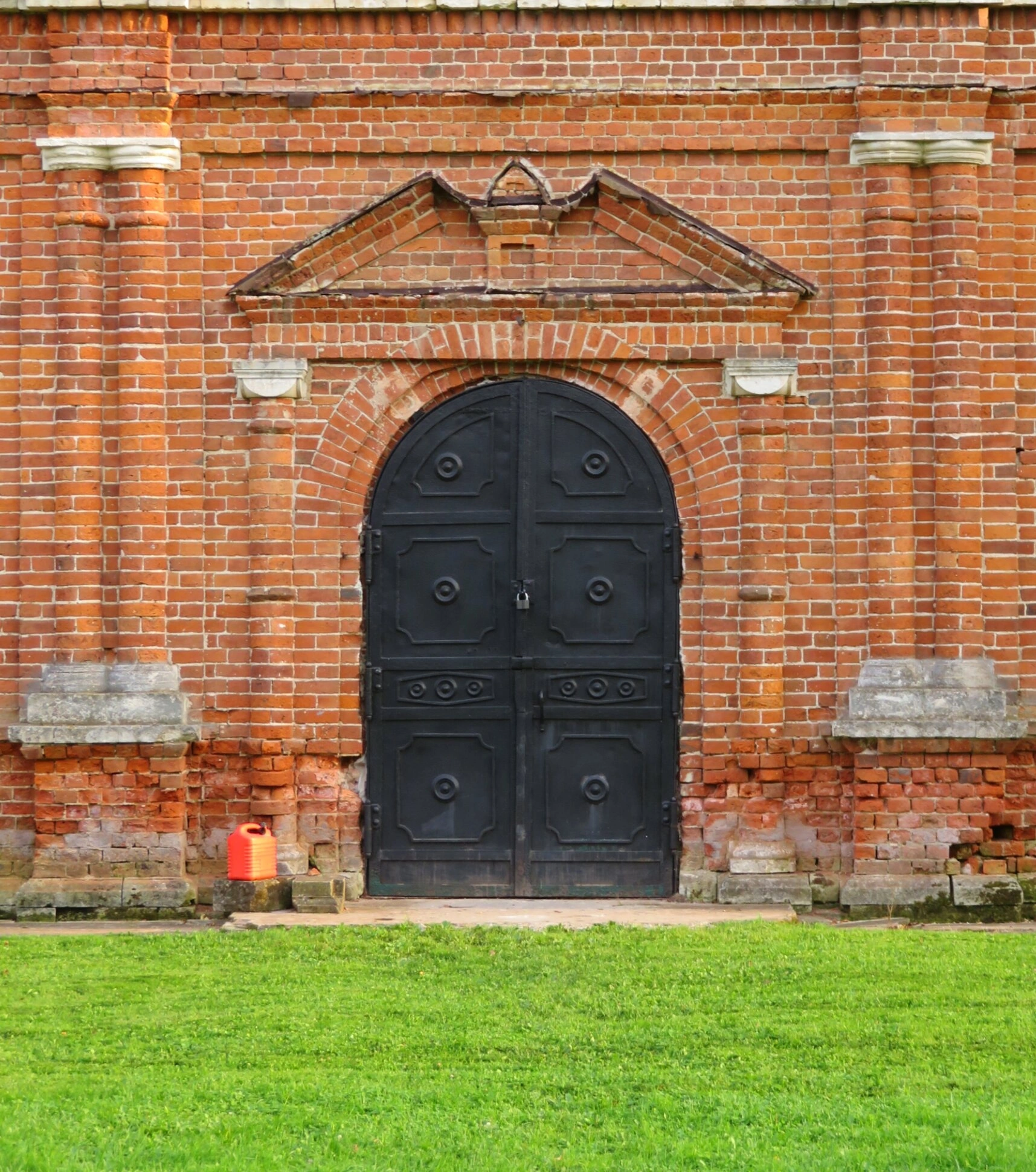 Центральным элементом композиции является массивная арочная дверь, выполненная из тёмного кованого металла. Её дугообразная форма, традиционная для церковной архитектуры, символизирует устремлённость человеческой души к горнему миру. Дверное полотно украшено фигурными коваными элементами и круглыми декоративными накладками-бусами, что придаёт ему особую монументальность и художественную выразительность. Этот вход, вероятно, ведёт в один из пределов храма или в трапезную часть.
