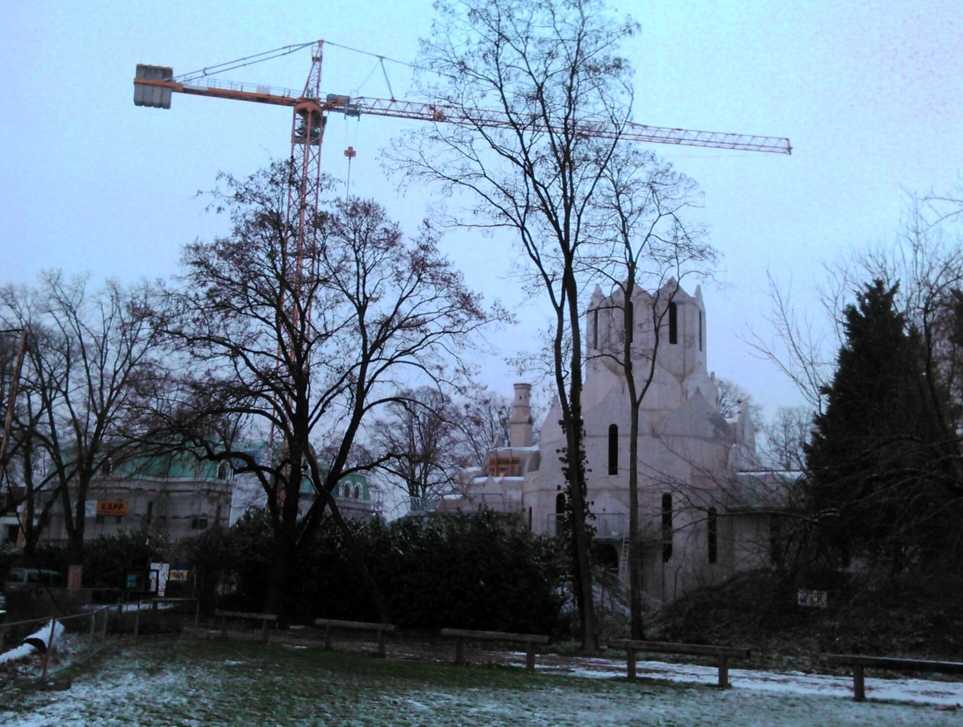 На заднем плане фотографии заметен строительный кран, который указывает на динамику городской жизни, окружающей островок духовной традиции. Храм Всех Святых был возведён и освящён в конце XX века, став важным символом возрождения православной веры в Западной Европе и свидетельством глубоких исторических и культурных связей.