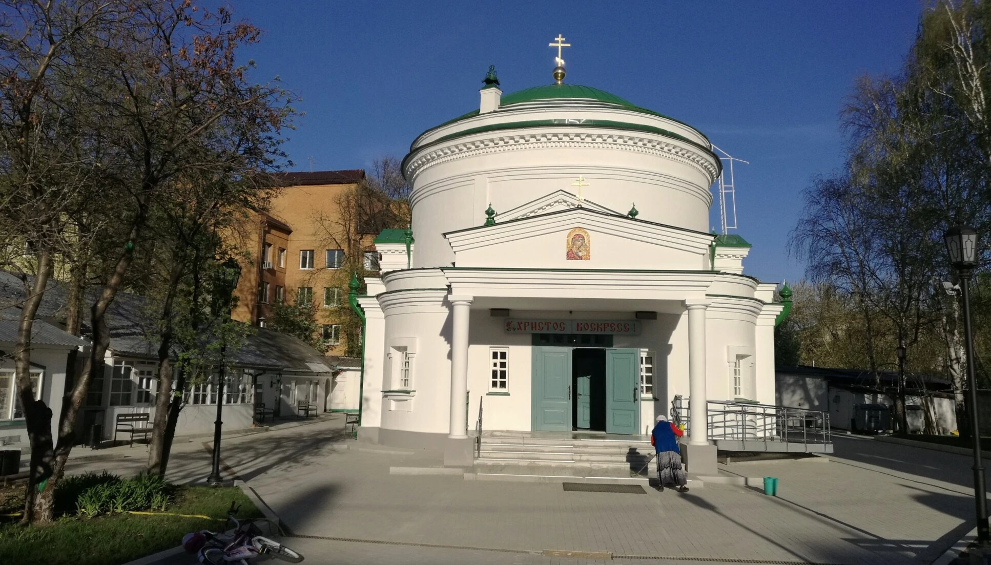 К храму ведут каменные ступени, а для обеспечения доступности маломобильным прихожанам оборудован удобный пандус. Территория вокруг церкви благоустроена: здесь высажены деревья, установлены скамьи для отдыха и фонарные столбы. На заднем плане фотографии виднеются городские здания, что подчёркивает гармоничное вхождение храма в городскую среду.