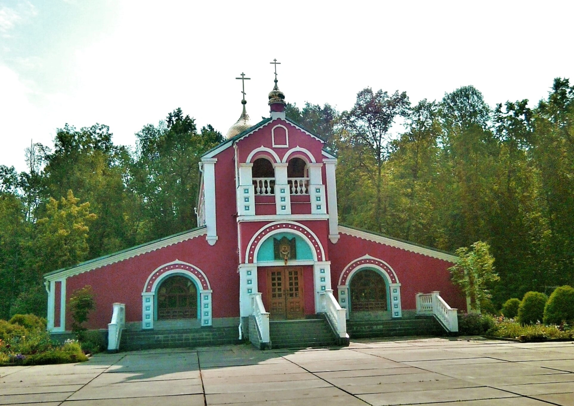 Фотография позволяет ощутить благодатную атмосферу этого святого места. Перед храмом расстилается аккуратная площадь, вымощенная плиткой, а сам он, окружённый густой зеленью деревьев и кустарников, словно прекрасный корабль спасения, плывёт в вечность под мирным небом. Снимок, сделанный в ясный день, запечатлел не просто архитектурный объект, но живую частицу Церкви Христовой, дом молитвы, созидавшийся верой, надеждой и любовью многих людей.