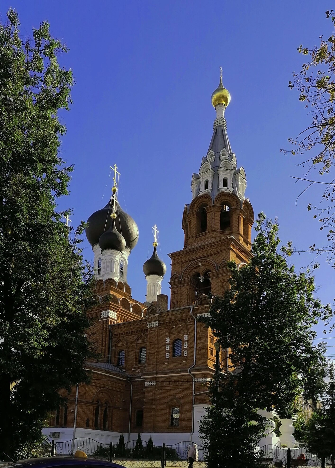 На представленной фотографии запечатлён величественный православный храм в честь Всемилостивейшего Спаса, расположенный в исторической части Нижнего Новгорода. Святыня, возведённая из красного кирпича, поражает своим благолепием и монументальностью. Чёткие линии, устремлённая в небо колокольня и сияющие на солнце купола создают образ неземной красоты и духовной мощи.