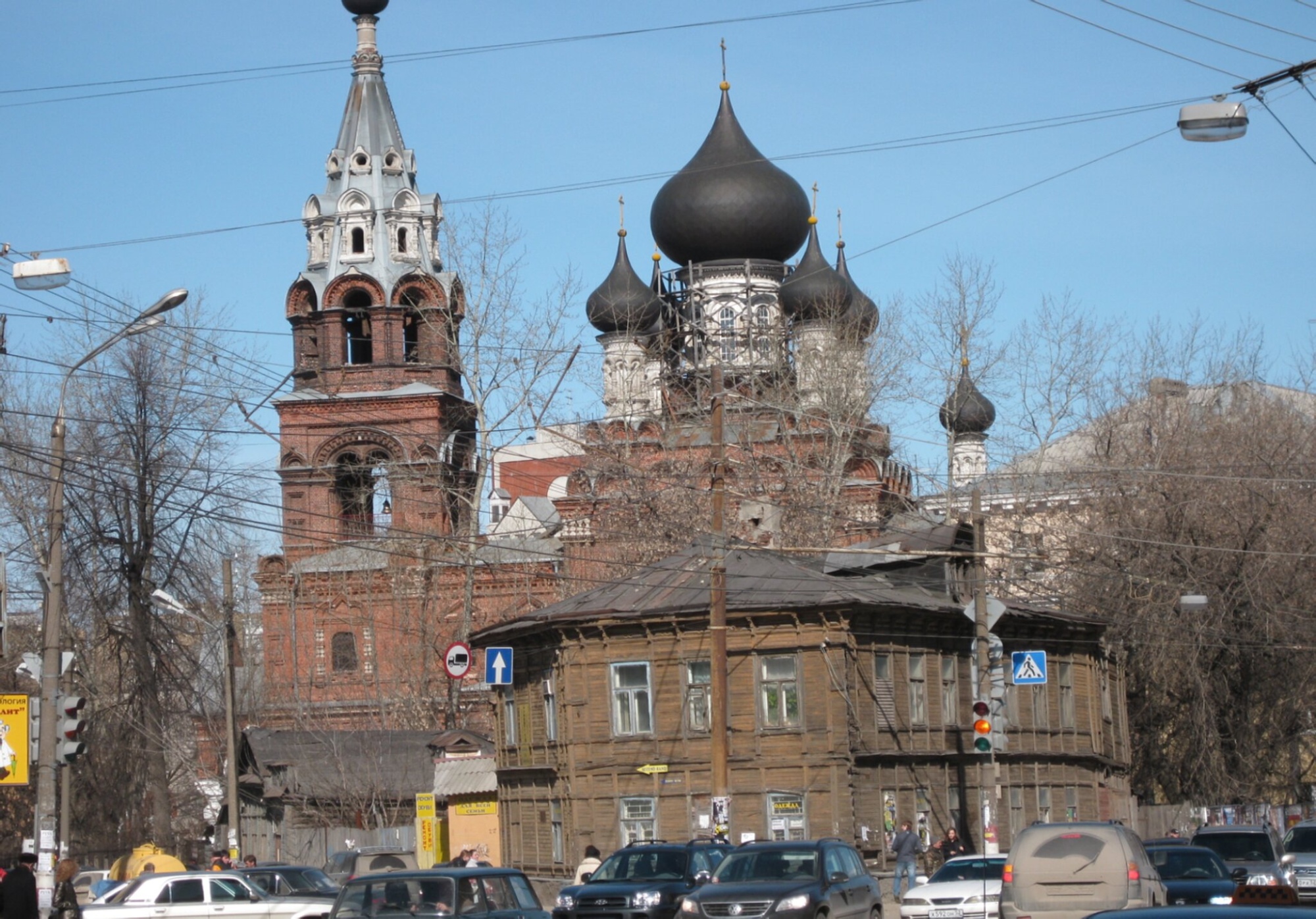 Фотография передаёт гармоничное, хотя и непростое, соседство святого места с современной городской жизнью. Перед храмом виден оживлённый перекрёсток, напоминающий о том, что церковь продолжает нести своё служение в самом сердце динамичного мегаполиса. Справа от святыни можно разглядеть образец исторической деревянной застройки, что добавляет снимку особый колорит и связь с прошлым.