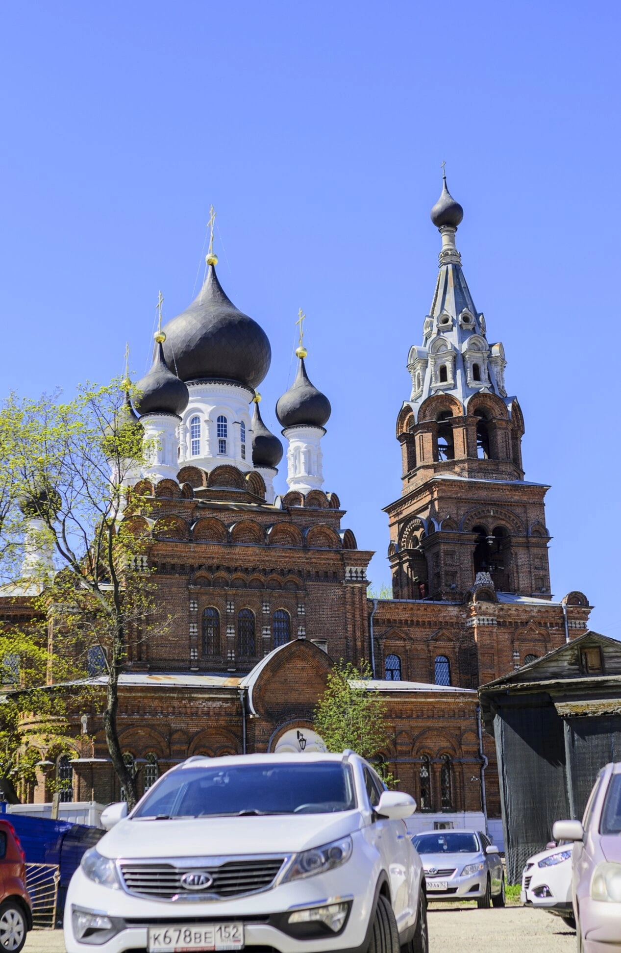 На представленной фотографии запечатлён величественный православный храм в честь Всемилостивого Спаса, расположенный в самом сердце Нижнего Новгорода. Святыня, возведённая из красного кирпича, является выдающимся образцом русского церковного зодчества конца XIX столетия. Её устремлённые в небо купола и высокая шатровая колокольня создают неповторимый силуэт, узнаваемый многими горожанами и паломниками.