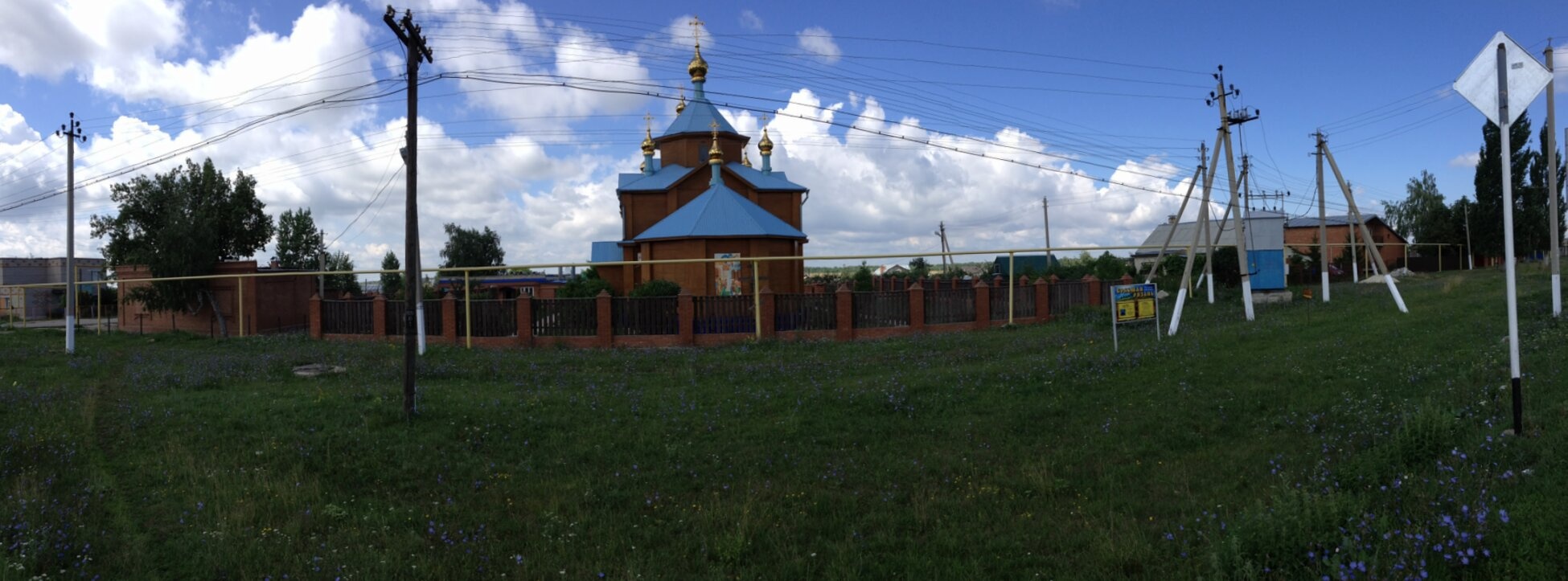 Храмовая территория благоустроена и огорожена невысоким забором. Перед святым входом простирается ухоженная зелёная поляна. На заднем плане фотографии виднеются элементы сельского быта — линии электропередач и скромная жилая застройка, что подчёркивает неразрывную связь храма с жизнью православной общины и миром. Небесный свод с облаками дополняет благостное настроение снимка, напоминая о непрестанной молитве, возносящейся от этого святого места.
