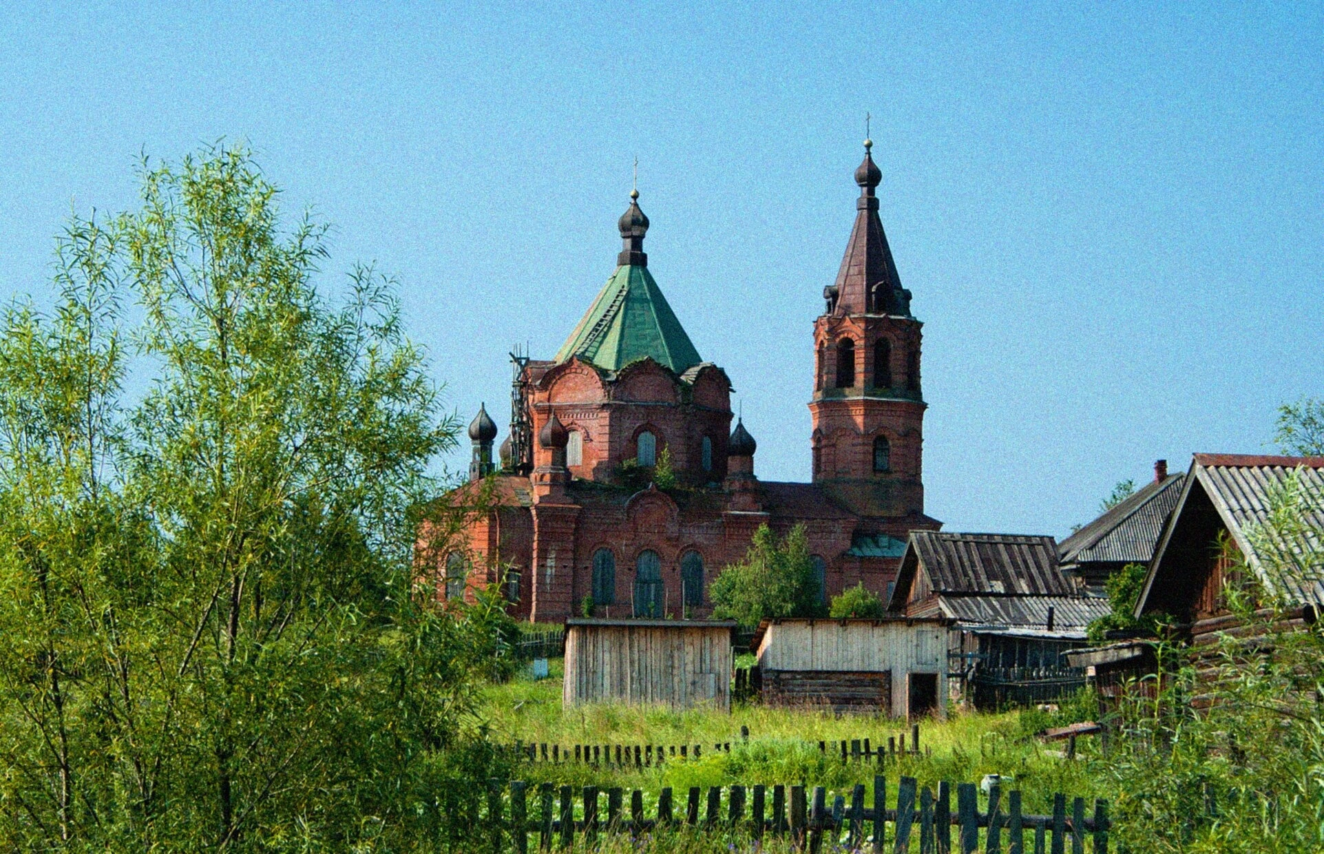 На фотографии запечатлена Церковь Введения во храм Пресвятой Богородицы, расположенная в селе Камгорт Чердынского района Пермского края. Храм возвышается на живописном холме, демонстрируя традиции русского церковного зодчества. Основной объём церкви и высокая колокольня сложены из красного кирпича, а венчают их зелёные купола, символизирующие жизнь и надежду.