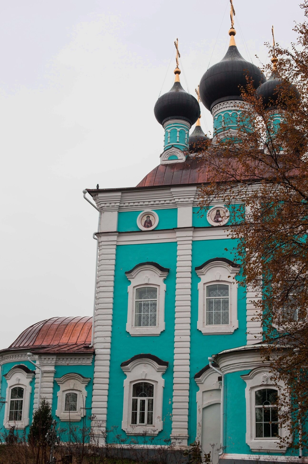 Венчают храм несколько чёрных куполов, выполненных в традиционной для Руси луковичной форме. Каждый из них увенчан златым крестом, сияющим как символ победы над смертью и вечной жизни во Христе. Осенняя листва дерева, виднеющегося справа, и пасмурное небо на заднем плане придают изображению особую атмосферу умиротворения и тихой молитвенной грусти, характерную для русской природы.