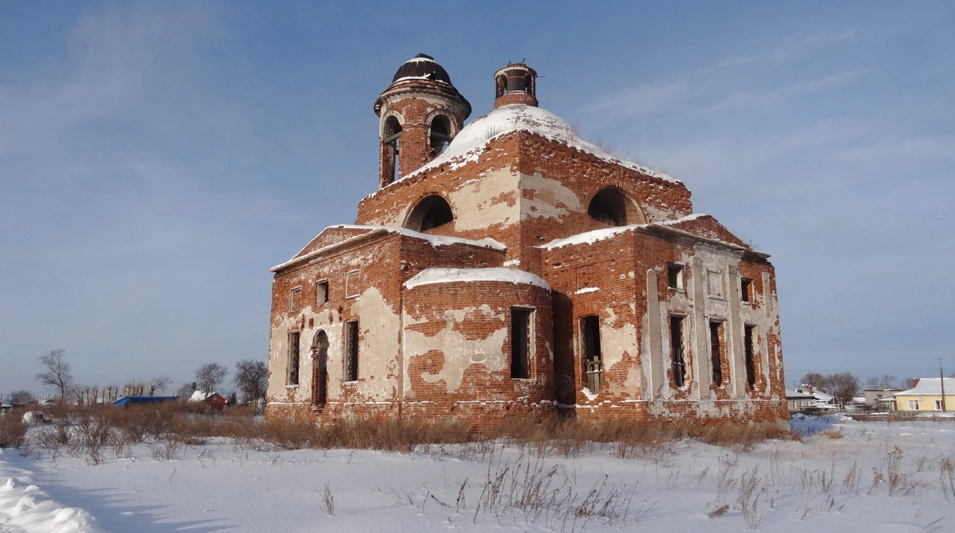 Ныне состояние храма, запечатлённого на снимке, можно охарактеризовать как руинированное. Однако даже в своих останках он свидетельствует о былой красоте и духовной силе, напоминая о многовековой православной истории русского села. Зимний пейзаж с заснеженными полями и редкими деревьями подчёркивает уединённость и тихую скорбь этого места, призывая к его сохранению и молитвенной памяти.