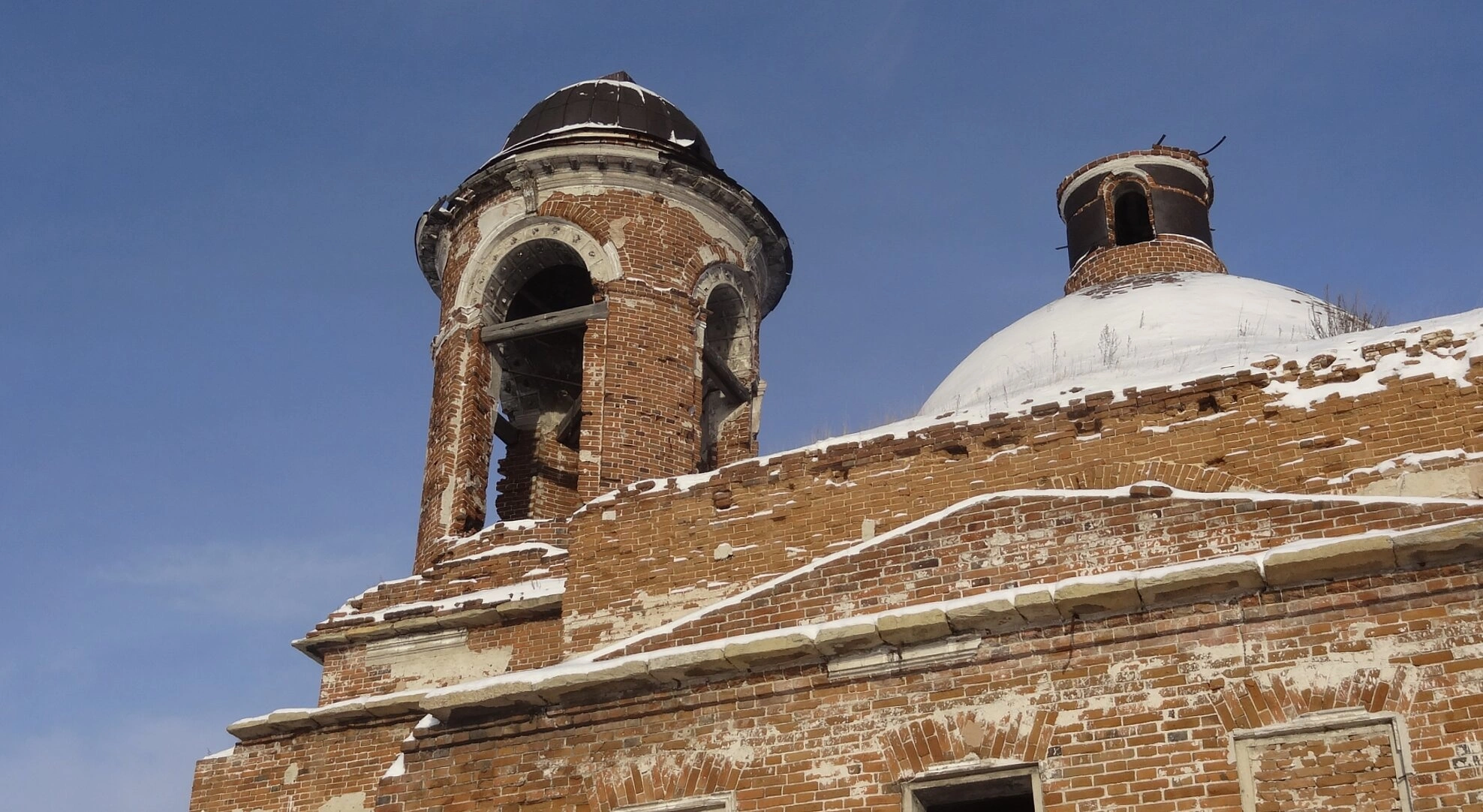 На фотографии запечатлена Церковь Введения во храм Пресвятой Богородицы, расположенная в селе Травянское Каменского муниципального округа Свердловской области. Этот православный храм, ныне пребывающий в полуразрушенном состоянии, представляет собой выдающийся памятник храмовой архитектуры XIX века, выполненный в стиле классицизм. Зимний пейзаж подчёркивает величие даже в руинах: снег покрывает кирпичные стены и частично сохранившиеся купола, свидетельствуя о запустении и необходимости восстановления святого места.