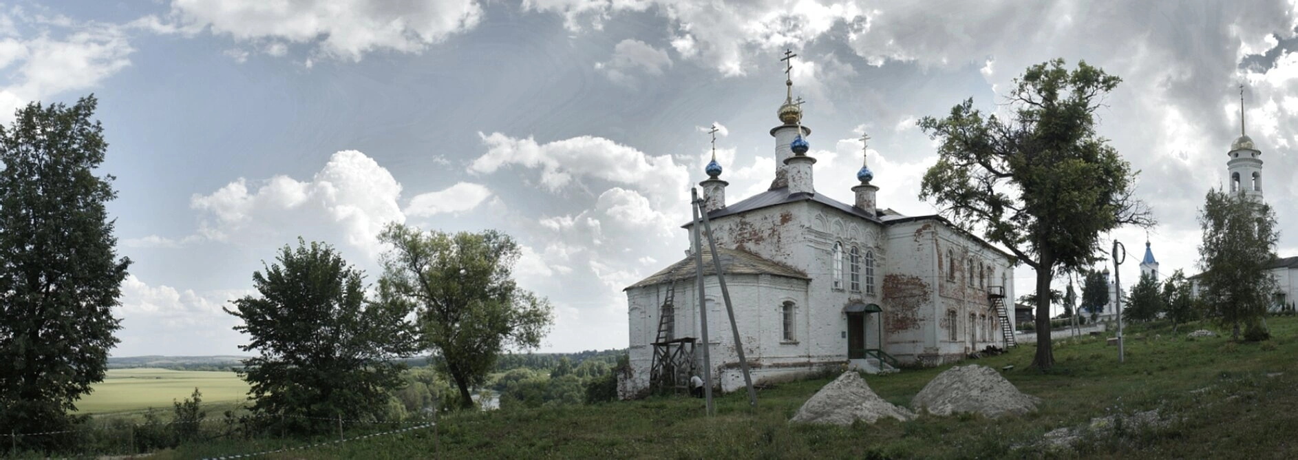На переднем плане фотографии открывается вид на монастырские строения, окружённые сохранившейся оградой. За храмом простираются бескрайние поля и луга, характерные для среднерусской природы. Монастырь, восстановленный из руин в начале XXI века, ныне является действующим и привлекает множество паломников, seekingщих поклониться святыням и насладиться благодатной тишиной святого места.