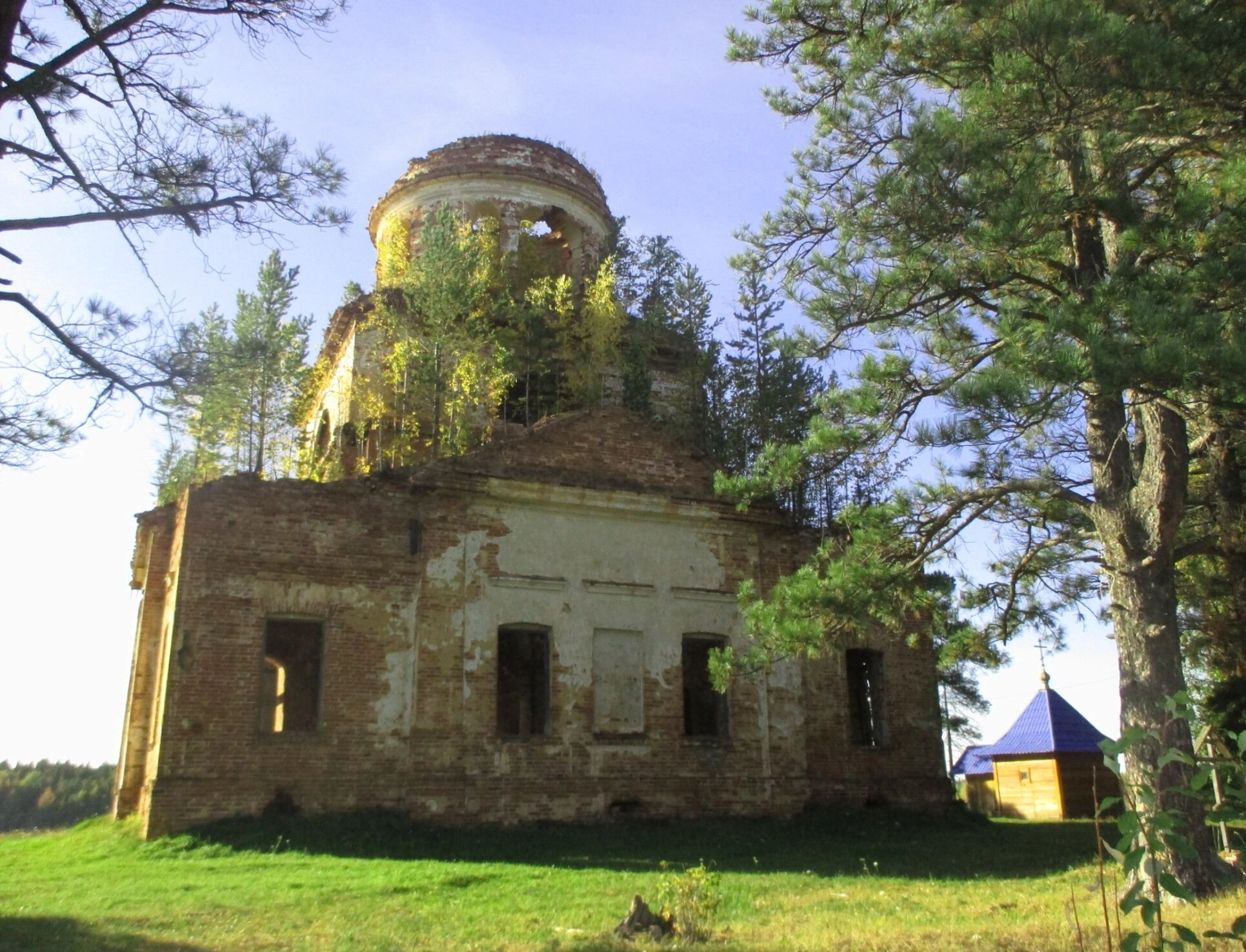 Справа от основного здания можно видеть сохранившуюся малую деревянную постройку, увенчанную синим куполом со звёздами, которая, вероятно, служила часовней или колокольней. Этот объект контрастирует с главным храмом своим более цельным видом, напоминая о первоначальном благолепии всего церковного комплекса.
