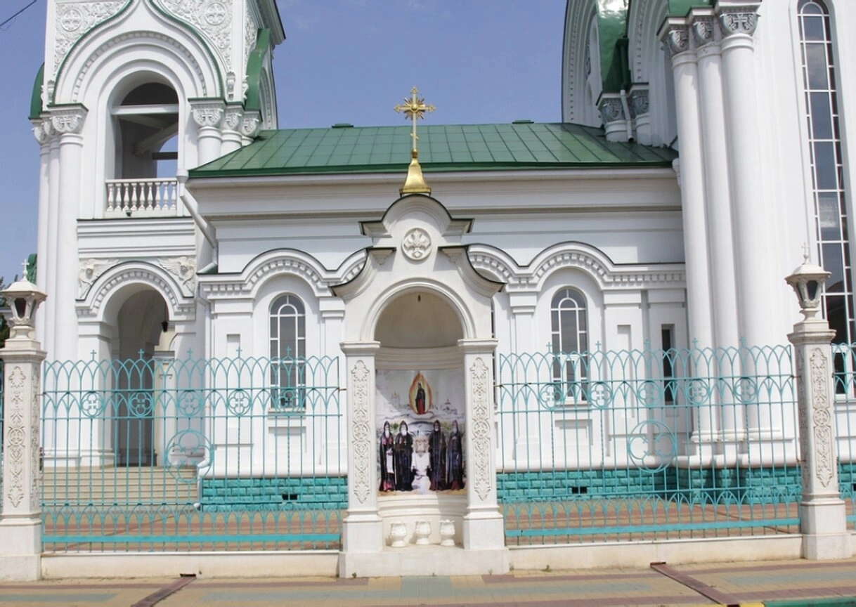 На представленной фотографии запечатлён величественный облик Храма Живоначальной Троицы, расположенного в городе Батайске Ростовской области. Белоснежные стены здания, увенчанные зелёными куполами с сияющими золотыми крестами, создают образ чистоты и духовного величия. Главный купол, символизирующий Господа Иисуса Христа, окружён четырьмя меньшими главами, что является каноническим для храмов, посвящённых Святой Троице.