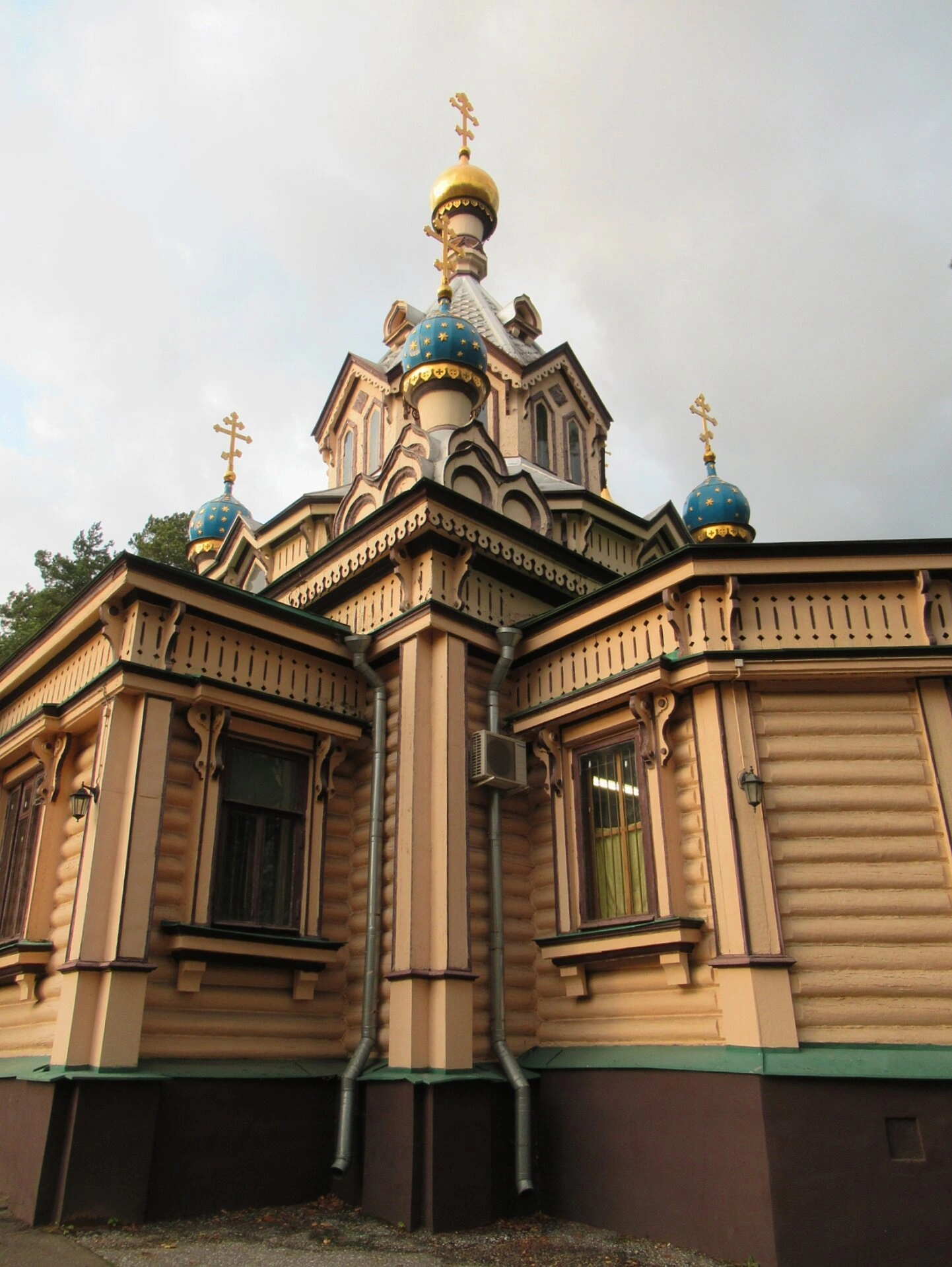 Деревянный храм, выполненный из добротного бревна светлого оттенка, являет собой образец традиционного церковного строительства. Его венчает прекрасное многоглавие: центральный золотой купол, символизирующий Господа Иисуса Христа, и окружающие его синие главы, украшенные золочеными звездами, что знаменует собою Богородицу и евангелистов. Каждый купол увенчан православным крестом — победным знамением спасения.