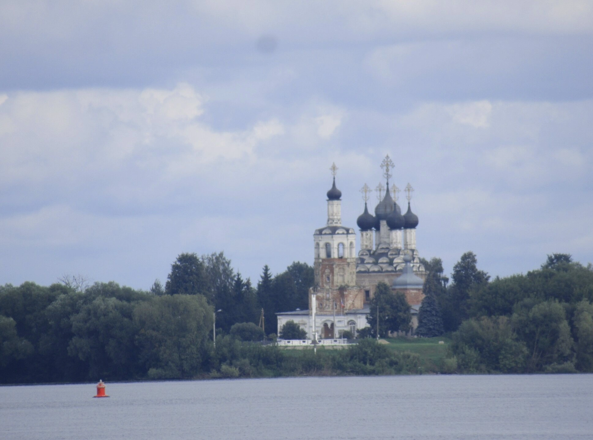 Храм живописно расположен на высоком берегу реки Оки, что подчёркивает его монументальность и гармоничную связь с окружающим ландшафтом. На снимке хорошо просматривается богатый кирпичный декор фасадов, характерный для данного стиля: наличники с разорванными фронтонами, многообломные карнизы, полуколонки и изразцовые вставки. Здание венчают пять глав, центральная из которых была позолочена в ходе реставрационных работ.