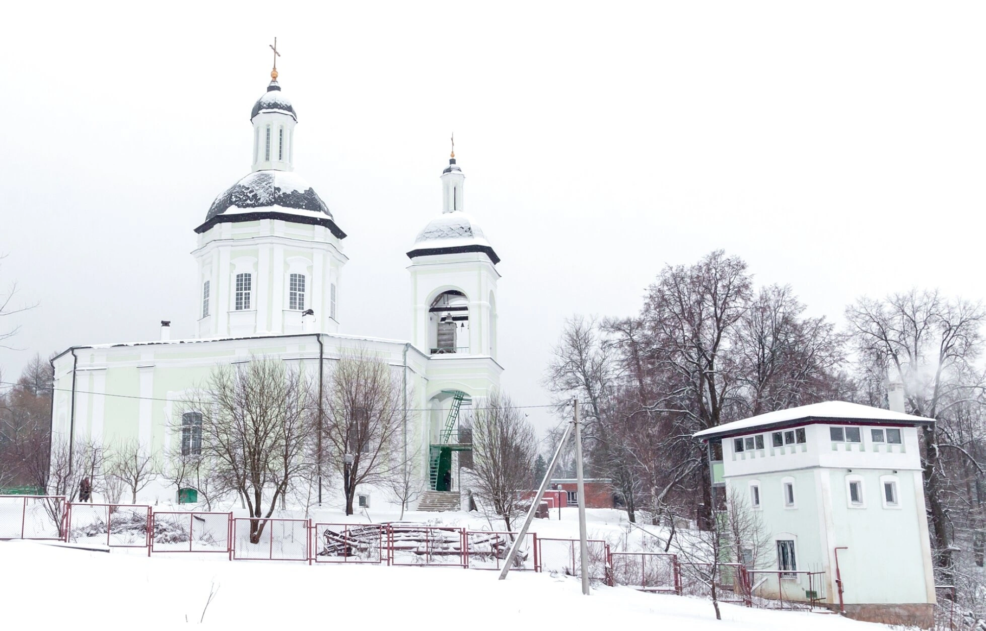 На представленной фотографии запечатлен зимний вид храма Живоначальной Троицы, расположенного в селе Ельдигино Пушкинского городского округа Московской области. Снежный покров мягко укутывает землю и кровлю зданий, создавая атмосферу благоговейной тишины и умиротворения, характерную для православных святынь в зимнее время.