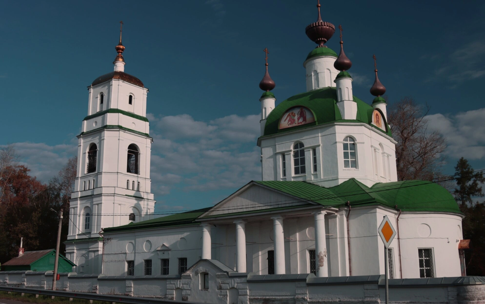 Отдельного внимания заслуживает колокольня, являющаяся неотъемлемой частью ансамбля. Её ярусы, прорезанные арочными звонами, завершаются золочёной главкой со шпилем, увенчанным крестом. Храм обнесён аккуратной оградой, а его окружает спокойный сельский пейзаж, подчёркивающий благодатную тишину и умиротворённость этого святого места.