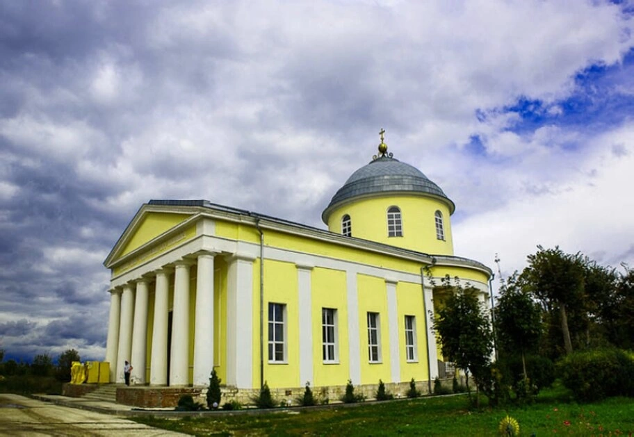 Архитектура каменной церкви относится к классическому русскому стилю с элементами барокко. Основной объём храма увенчан мощным световым барабаном, на котором возвышается изящный золочёный купол, символизирующий небесную славу. Фасад здания окрашен в тёплый охристый цвет, что создаёт ощущение благодати и света, а белоснежные колонны и декоративные элементы подчёркивают монументальность и величие дома Божьего.