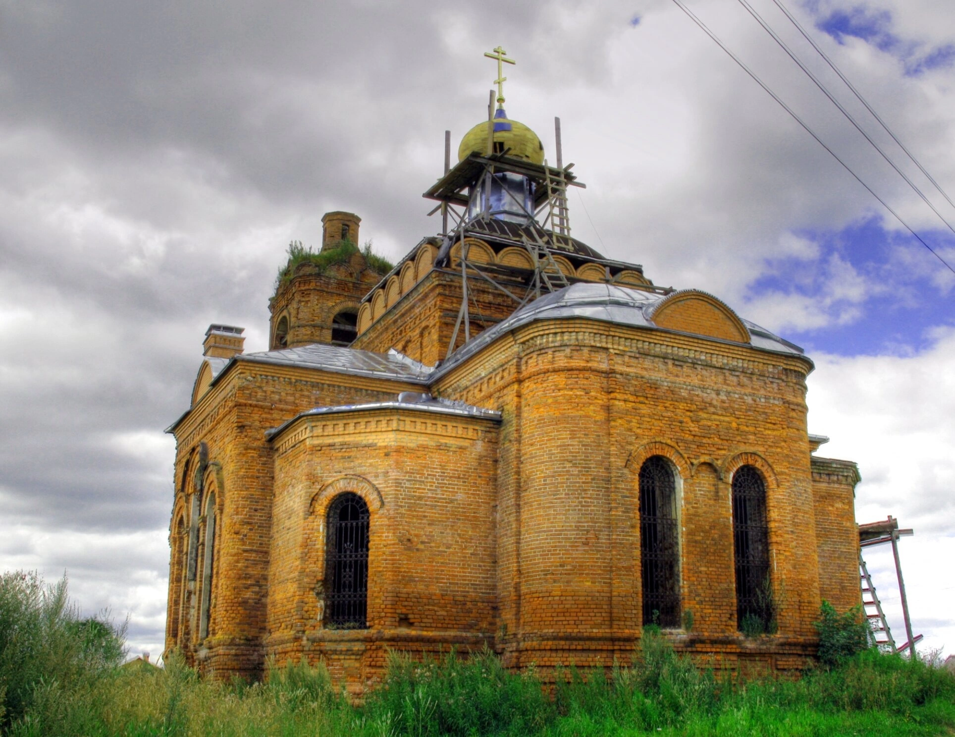 На представленной фотографии запечатлён храм Живоначальной Троицы, расположенный в селе Новлянское Московской области. Святыня, возведённая из красного кирпича, демонстрирует характерные для русского церковного зодчества черты: арочные оконные проёмы, увенчанные решётками, и стройную колокольню, главный купол которой венчает православный крест.