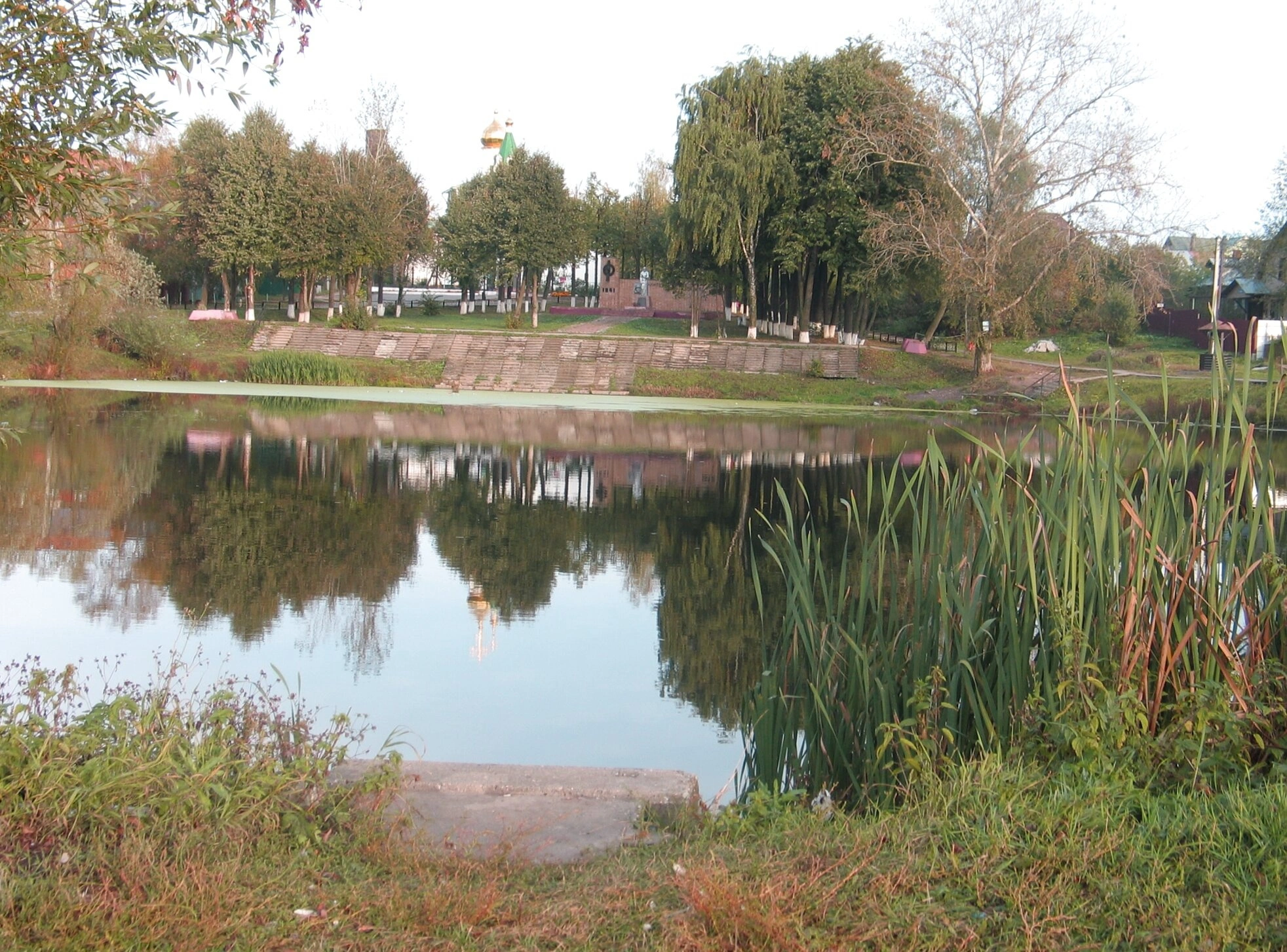 На переднем плане обращают на себя внимание густые заросли тростника и прибрежной травы, обрамляющие водоём. Чистый ухоженный берег свидетельствует о заботе местных жителей об этом благостном месте. На противоположном берегу открывается вид на уютный сквер с аккуратными дорожками, ведущими к храму.