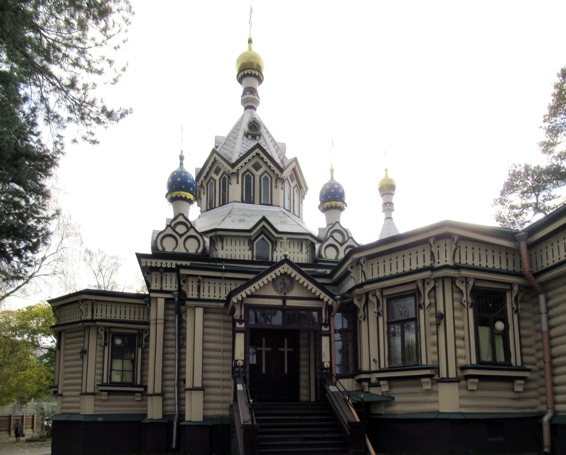На представленной фотографии запечатлён величественный облик Храма Живоначальной Троицы, расположенного в посёлке Удельная Раменского городского округа Московской области. Деревянная церковь, освящённая во имя Святой Троицы, является выдающимся памятником русского православного зодчества конца XIX века.