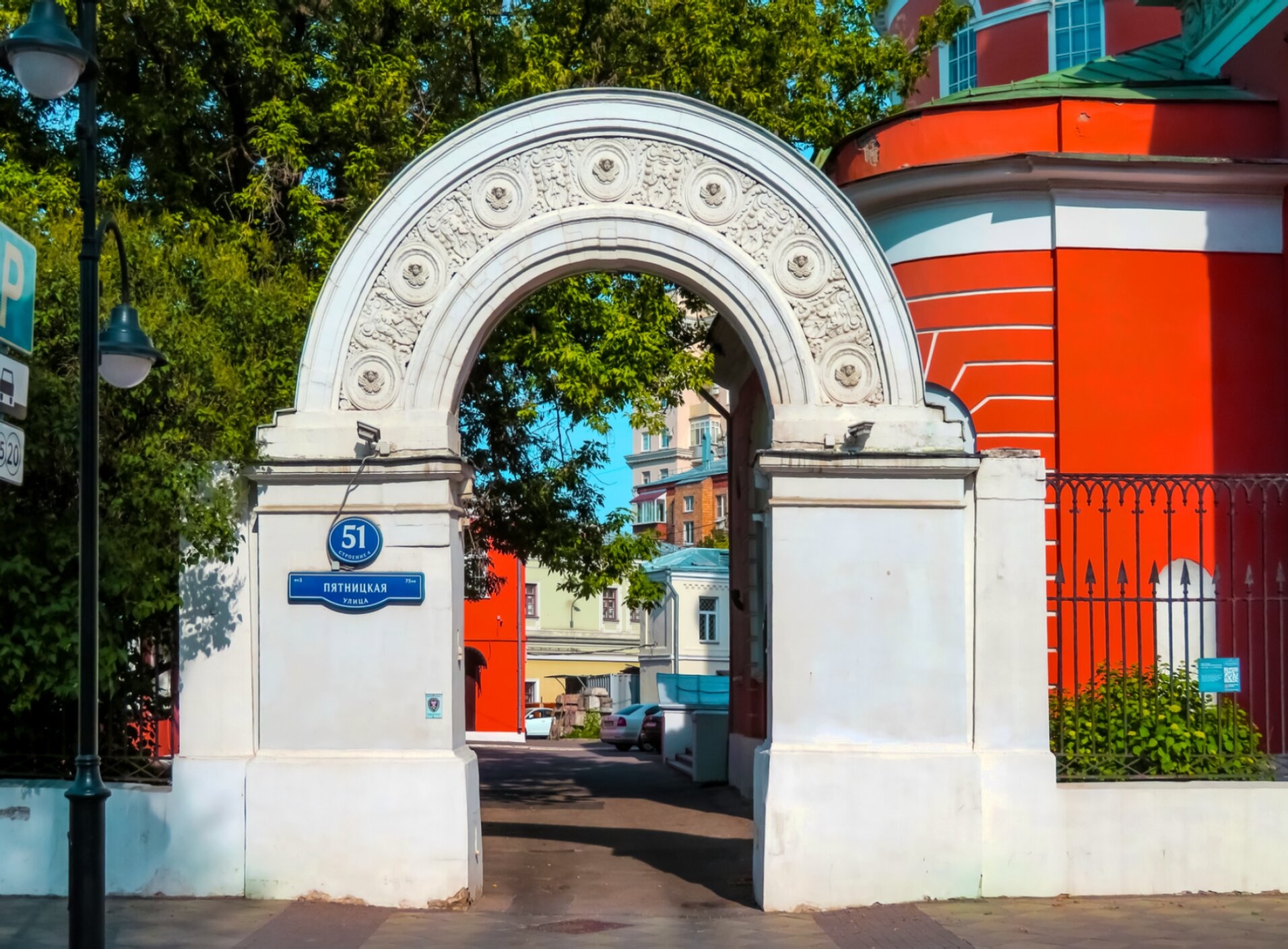 На представленной фотографии запечатлен величественный вход на территорию храма Живоначальной Троицы в Вешняках, что в Замоскворечье. Каменная арка с воротами, увенчанная изящной колокольней, служит парадным входом в святую обитель. На синей табличке, укрепленной на арке, указан адрес: Пятницкая улица, дом 51.