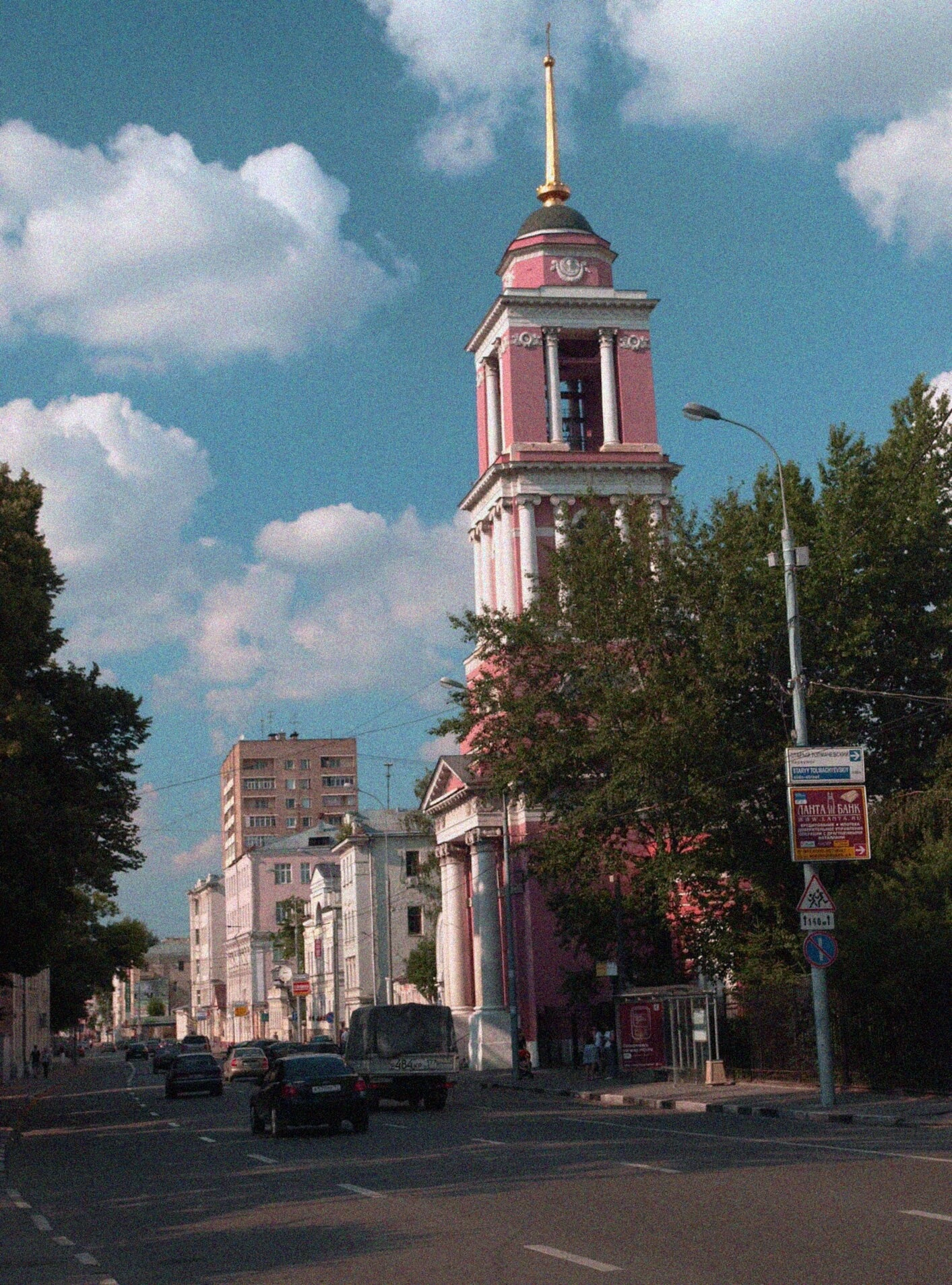 На представленной фотографии запечатлена колокольня храма Живоначальной Троицы, что в Вишняках, — одна из узнаваемых православных достопримечательностей Москвы, расположенная в Замоскворечье, на Пятницкой улице. Монументальное сооружение, выполненное в стиле ампир, служит архитектурной доминантой данной местности и является ярким свидетельством церковного зодчества первой трети XIX века.