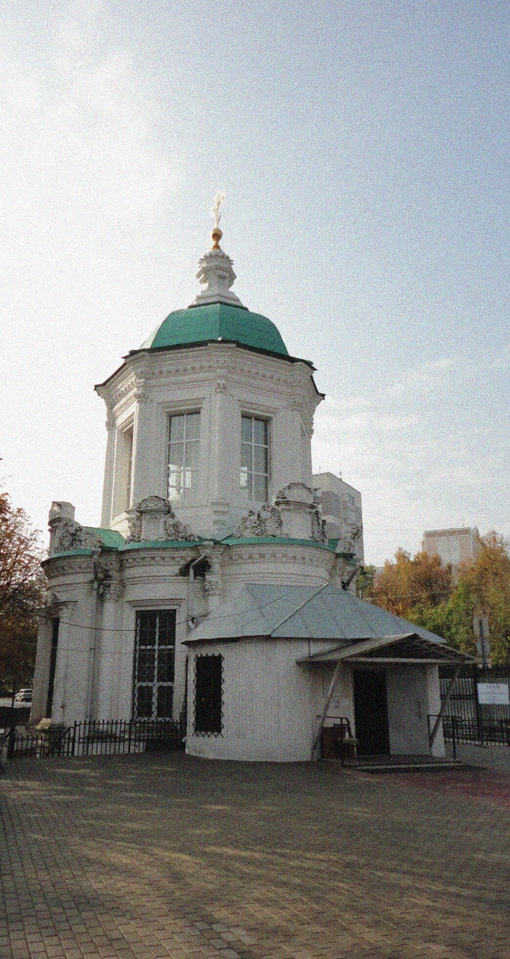 Храм стоит на обширной мощёной территории, обнесённой аккуратной оградой, что создаёт ощущение уединённости и благодатного покоя. На заднем плане виднеются кроны деревьев и элементы городской застройки, напоминая о том, что святыня гармонично существует в самом сердце столицы. Церковь находится по адресу: город Москва, улица Лазо, дом 7.