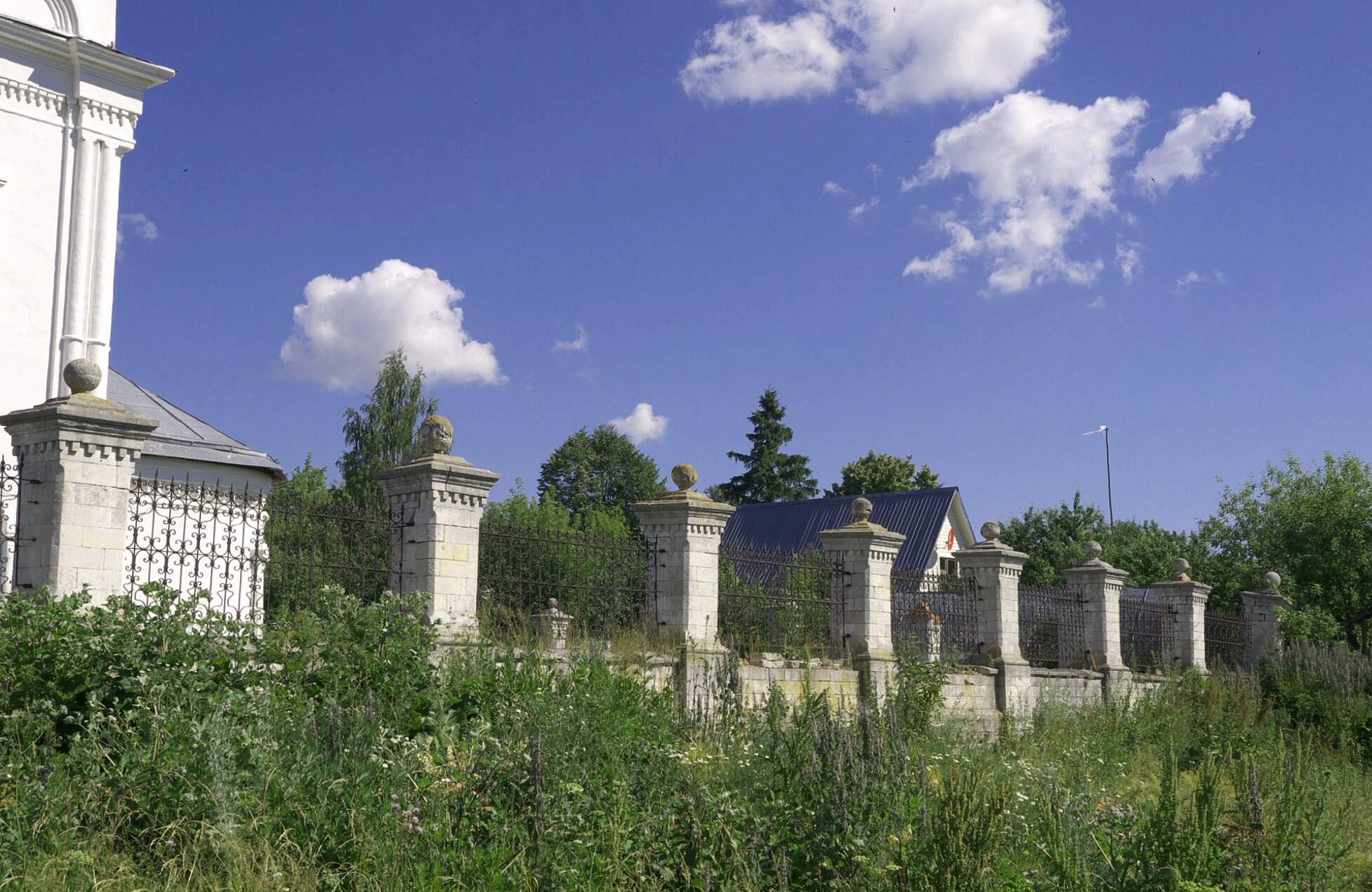 На представленной фотографии запечатлена историческая ограда с ажурными воротами Церкви Казанской иконы Божией Матери, расположенной в селе Киясово. Каменные столбы, выполненные в традициях православного зодчества, поддерживают кованые металлические элементы, образующие изящный рисунок, символизирующий духовную защиту и неприкосновенность священного пространства. За оградой просматривается белоснежный фасад храма, утопающий в зелени деревьев и кустарников, что создаёт ощущение гармонии между божественным творением и природной красотой. Высокая трава и дикорастущие растения подчёркивают атмосферу уединённости и молитвенного покоя, характерную для этого святого места. На заднем плане виднеется крыша церковного строения и голубое небо с облаками, напоминающее о небесной благодати, нисходящей на православную святыню. Село Киясово, где расположен храм, имеет глубокие духовные традиции, а сама Церковь Казанской иконы Божией Матери является объектом культурного и исторического наследия, привлекающим паломников и ценителей православной архитектуры. Ограда с воротами, изображённая на фотографии, не только выполняет практическую функцию, но и служит символом врат в духовный мир, напоминая верующим о переходе от мирской суеты к божественной благодати.