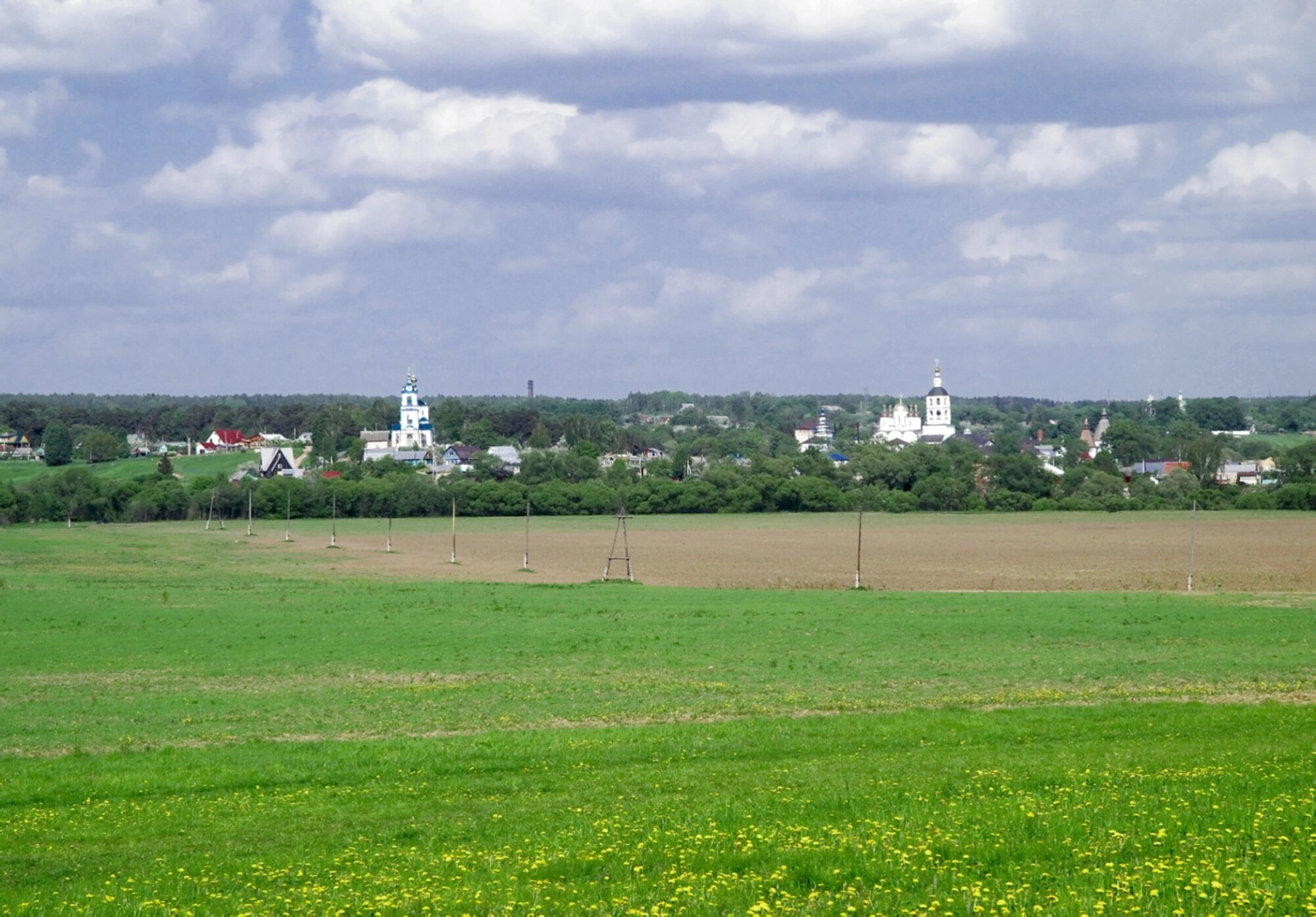 На представленной фотографии запечатлен благодатный вид на православные храмы деревни Роща, входящей в городское поселение Боровск Калужской области. Снимок передает умиротворяющую атмосферу русского духовного ландшафта, где архитектурное наследие гармонично вписано в природное окружение.
