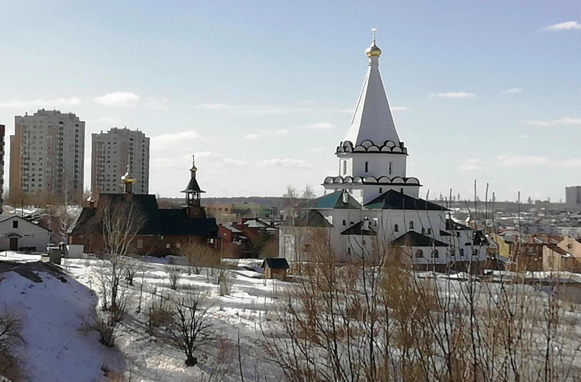 На заднем плане, сквозь безлиственные ветви деревьев, виднеются современные жилые строения, что подчёркивает неразрывную связь времён и непреходящее значение православной веры в жизни города. Чистое голубое небо простирается над святыней, озаряя её благодатным светом. Этот зимний пейзаж передаёт особую тишину, умиротворение и благоговейную красоту, присущую русским храмам в любое время года.