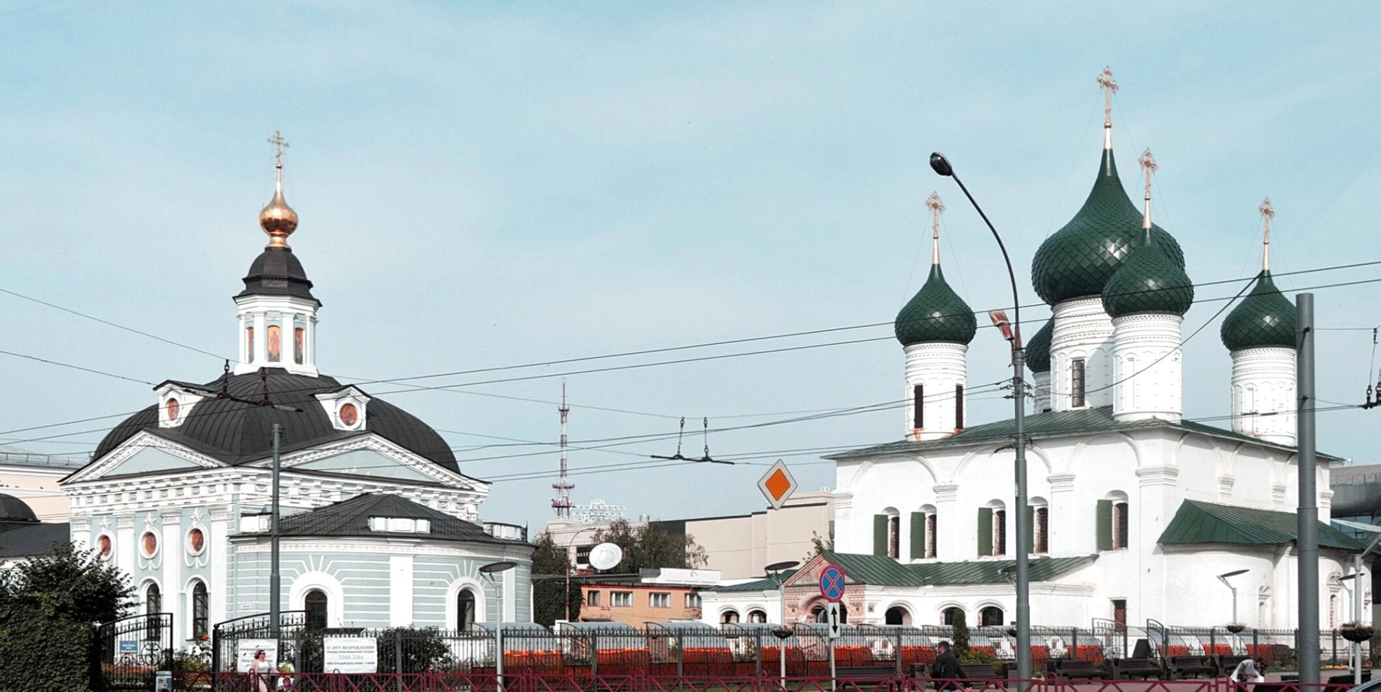 На представленной фотографии запечатлён выдающийся памятник церковной архитектуры и духовной жизни Ярославля — храмовый комплекс Вознесенско-Сретенского прихода, расположенный по адресу: улица Свободы, 44А. Ансамбль состоит из двух прекрасных храмов: пятиглавой Церкви Вознесения Господня и одноглавой Сретенской церкви.