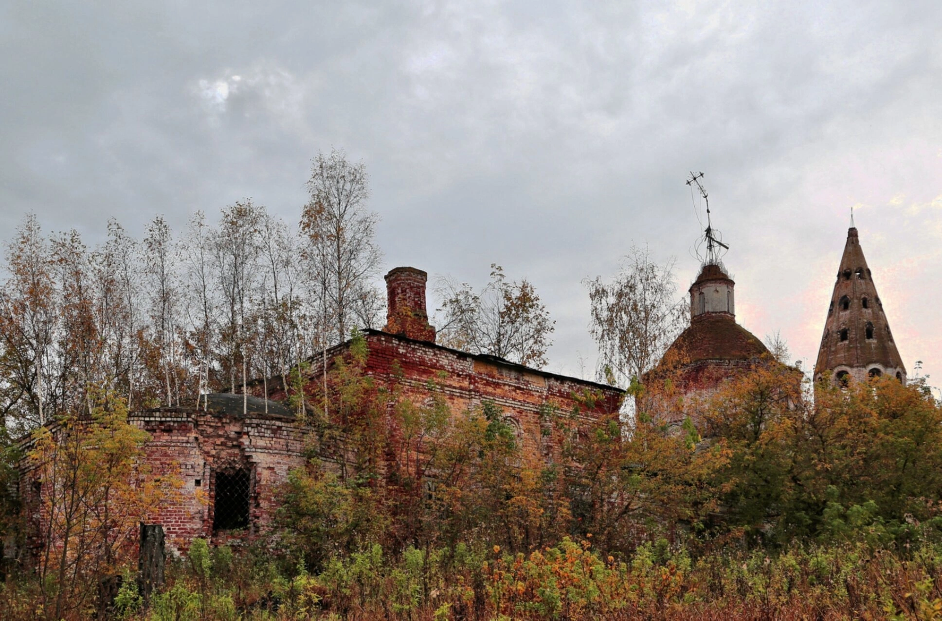 Справа от Троицкой церкви возвышается Преображенская церковь, построенная в 1805 году. Этот просторный летний храм предназначался для проведения богослужений в тёплый период года. Здание отличается более монументальными формами и высоким куполом, который, как видно на фотографии, также требует восстановительных работ. Оба храма являются яркими примерами православного зодчества Владимирской земли.