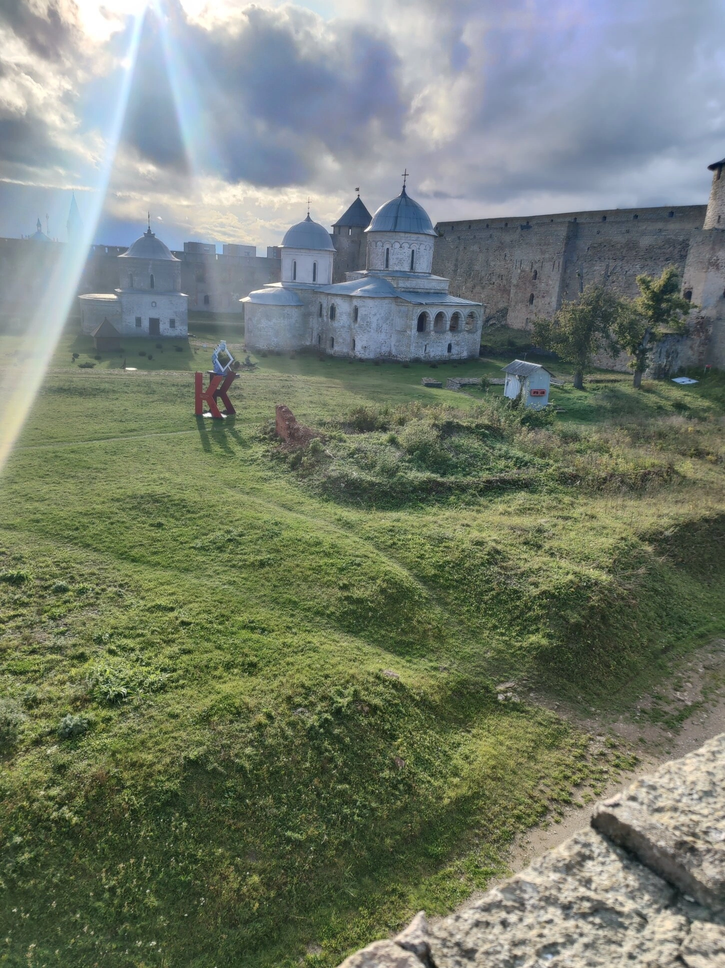 На представленной фотографии запечатлён уникальный ансамбль православных святынь в сердце Ивангородской крепости, что на самой границе с Эстонией. В фокусе изображения находятся два исторических храма, являющихся не только архитектурным, но и духовным наследием Северо-Запада России: церковь Святителя Николая Чудотворца (слева) и Успенский собор (справа).