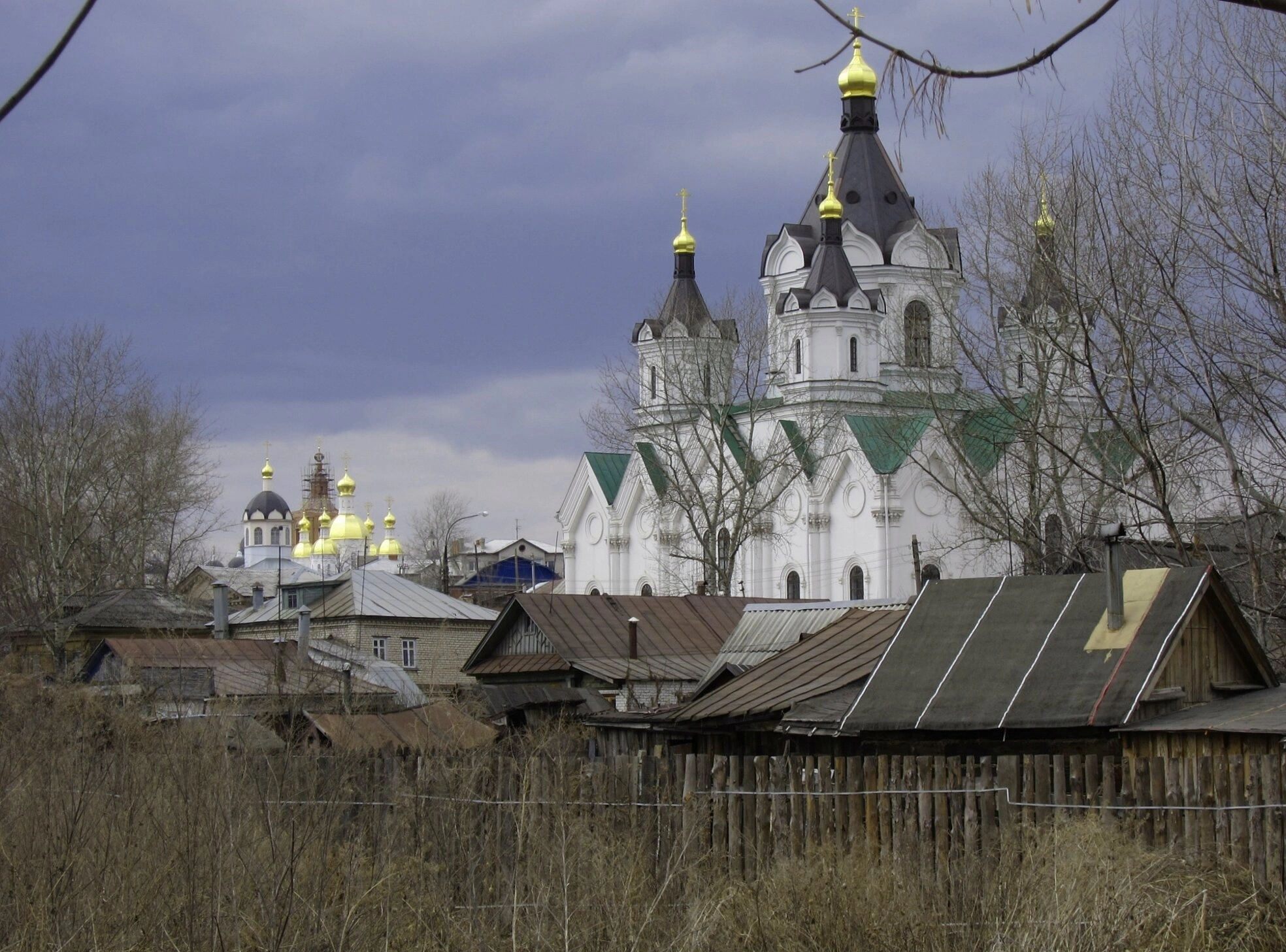 На представленной фотографии запечатлён величественный вид Церкви Рождества Христова, одного из старейших православных храмов города Арзамаса Нижегородской области. Снимок сделан в холодное время года, о чём свидетельствуют безлистные деревья и особая световоздушная атмосфера зимнего дня. На переднем плане видны традиционные деревянные дома исторической застройки города, подводящие взгляд к главному доминанте кадра – белоснежному храму с сияющими на пасмурном небе златыми куполами.