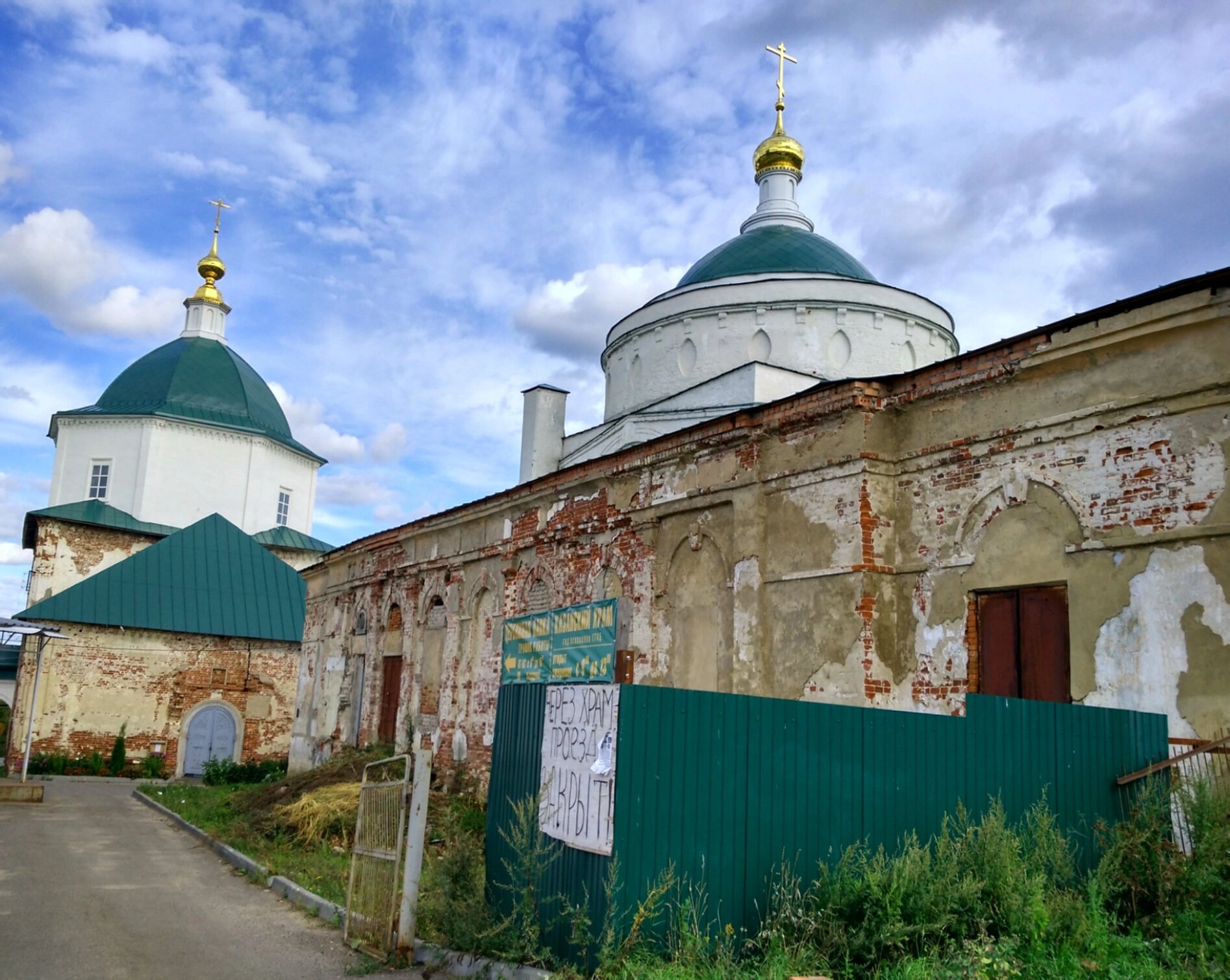 На переднем плане справа видна часть каменной церковной постройки, предположительно трапезная или один из приделов. Состояние здания свидетельствует о его почтенном возрасте: местами осыпалась штукатурка, обнажив добротную кирпичную кладку. Несмотря на следы временного запустения, строение не выглядит разрушающимся и сохраняет величественный вид. Над этой частью храма возвышается изящный барабан, увенчанный куполом, окрашенным в белый цвет и покрытым зеленой кровлей. На самой вершине купола сияет позолоченный православный крест, устремленный в небеса.