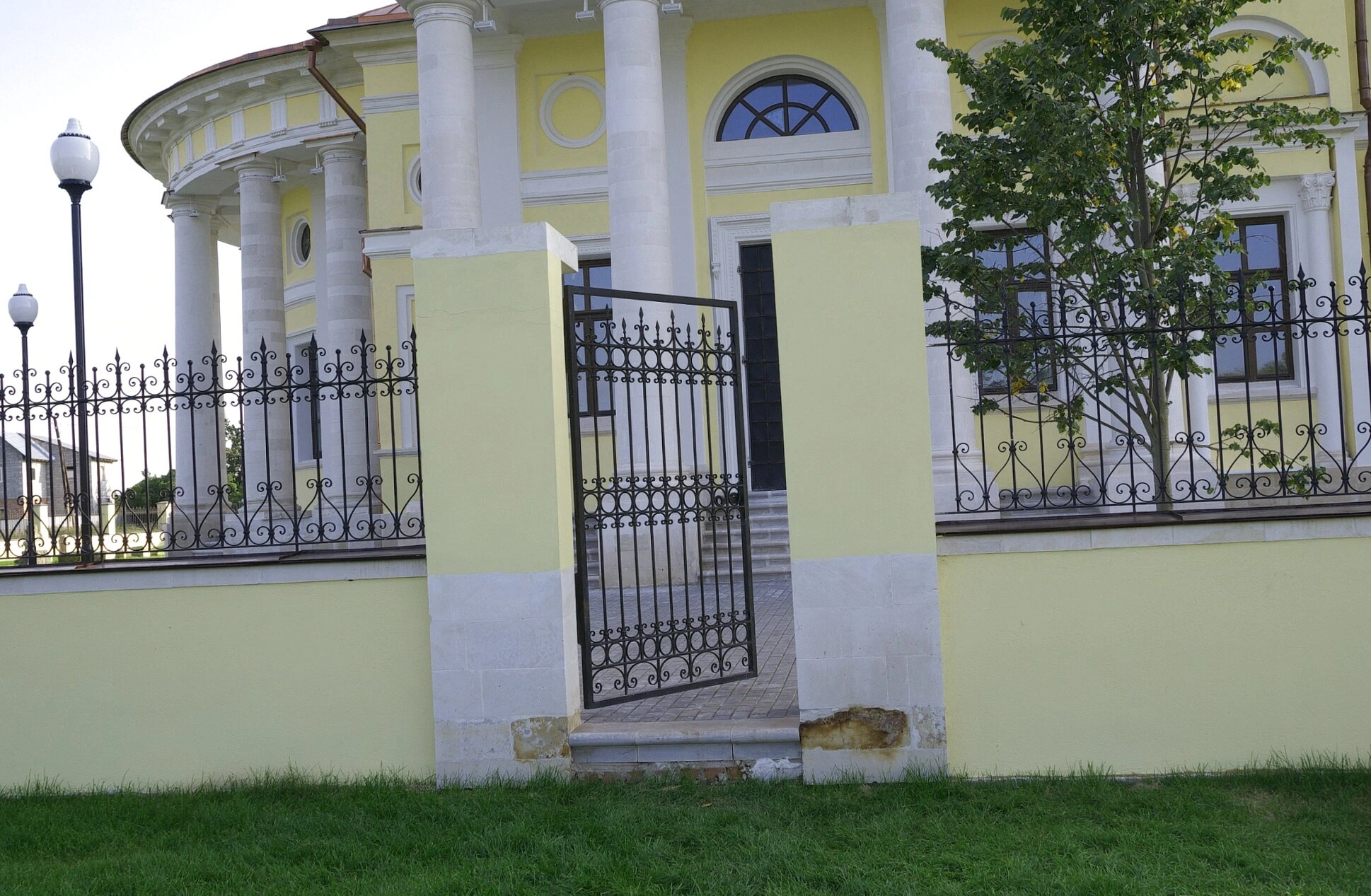 Территория храма обнесена художественной кованой оградой черного цвета, установленной на каменном основании. Декоративные завитки металлической решетки свидетельствуют о высоком мастерстве кузнецов. Центральный вход оформлен двухстворчатыми коваными воротами, ведущими к каменной лестнице, что символизирует духовное восхождение верующих. По сторонам от входа расположены массивные прямоугольные столбы, завершающие архитектурную композицию.