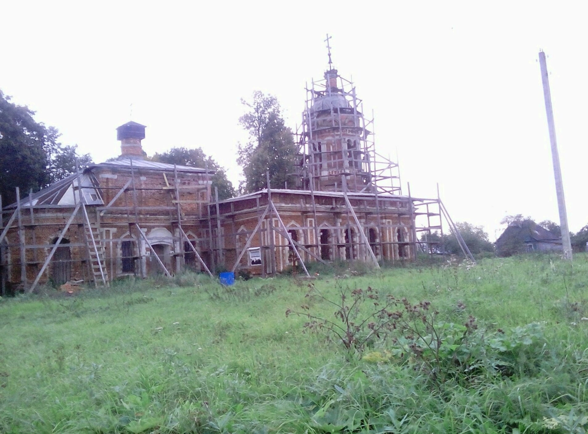 Несмотря на следы разрушения, утраты кровли и повреждения фасадов, величественный силуэт церкви продолжает доминировать в окружающем сельском пейзаже. Заброшенная территория, поросшая травой, и строительные леса создают образ скорби и надежды одновременно, напоминая о сложной судьбе православия в России и о возрождении поруганных святынь. Восстановление этого храма является делом благочестия и сохранения национального культурного наследия.