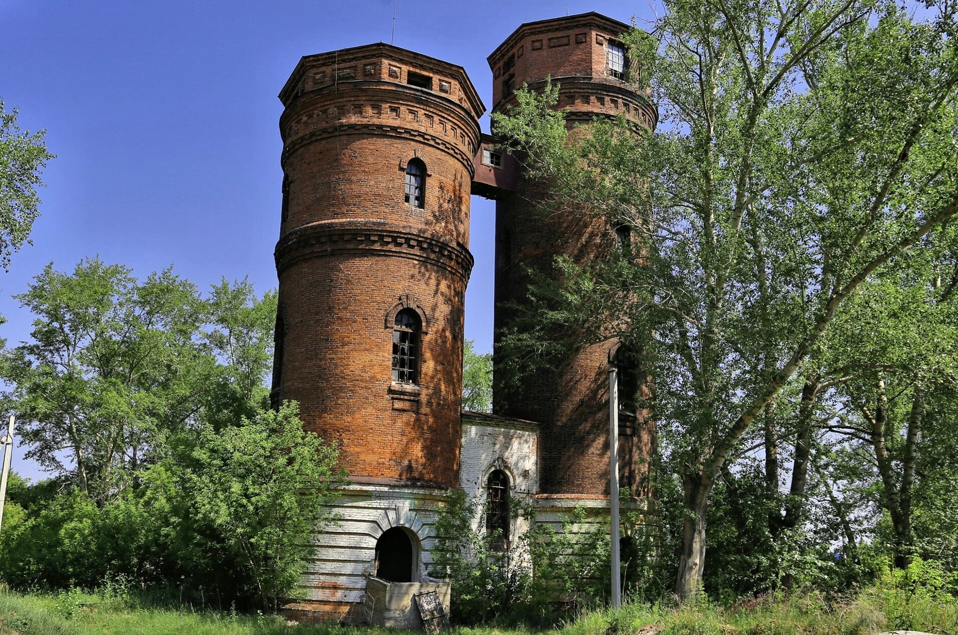 На представленной фотографии запечатлены сохранившиеся сооружения бывшей Христорождественской церкви, расположенной в селе Слобода-Бешкиль Исетского района Тюменской области. Две монументальные кирпичные башни, соединенные арочным переходом, являются уцелевшими элементами некогда величественного храмового комплекса.