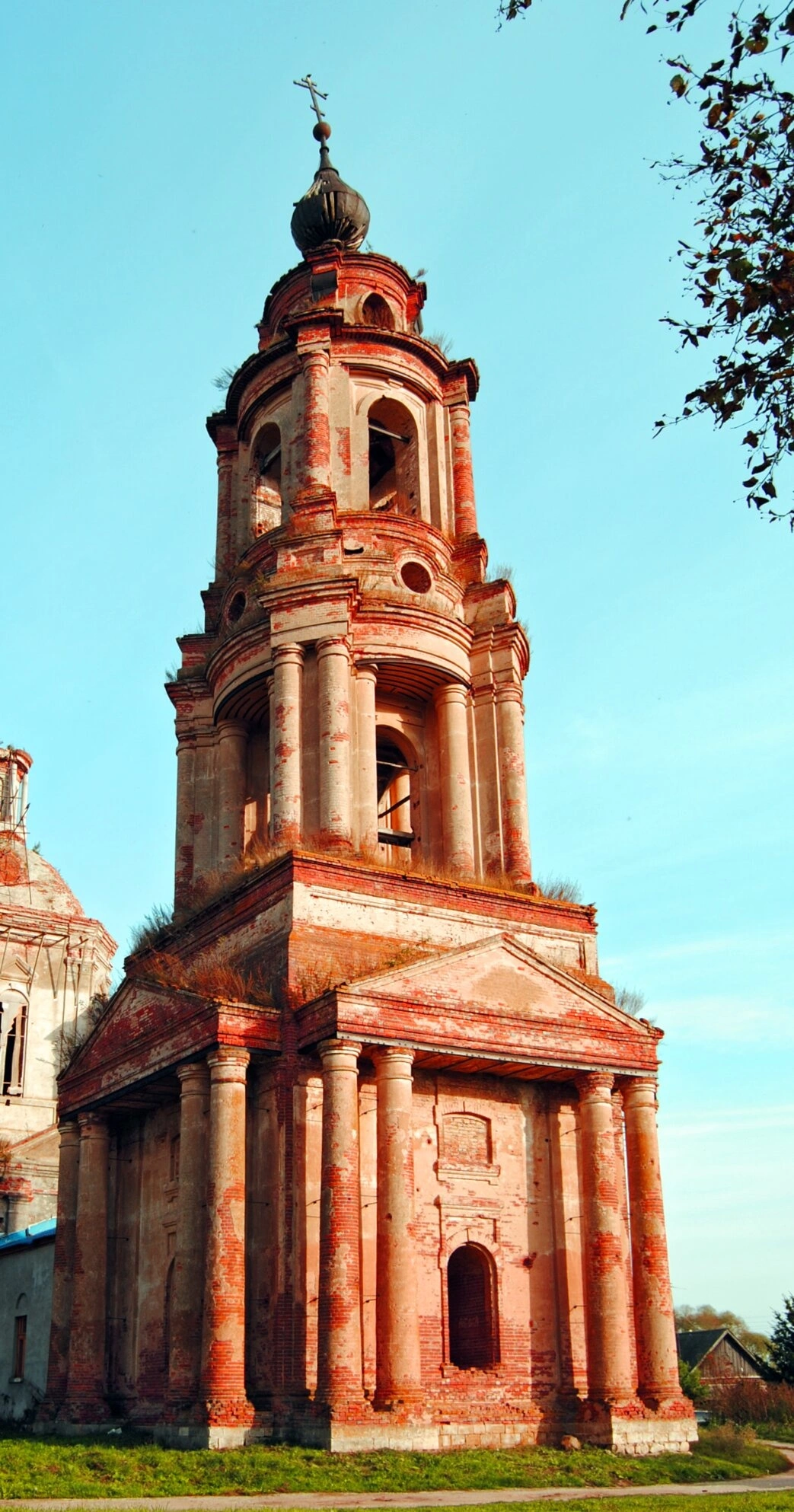 На представленной фотографии запечатлена колокольня Храма в честь Рождества Христова, расположенного в селе Щелканово Юхновского района Калужской области. Многоярусное сооружение, увенчанное куполом и крестом, выполнено в стиле классицизма и демонстрирует характерные для данной эпохи архитектурные элементы: колонны, арки и строгие пропорции.