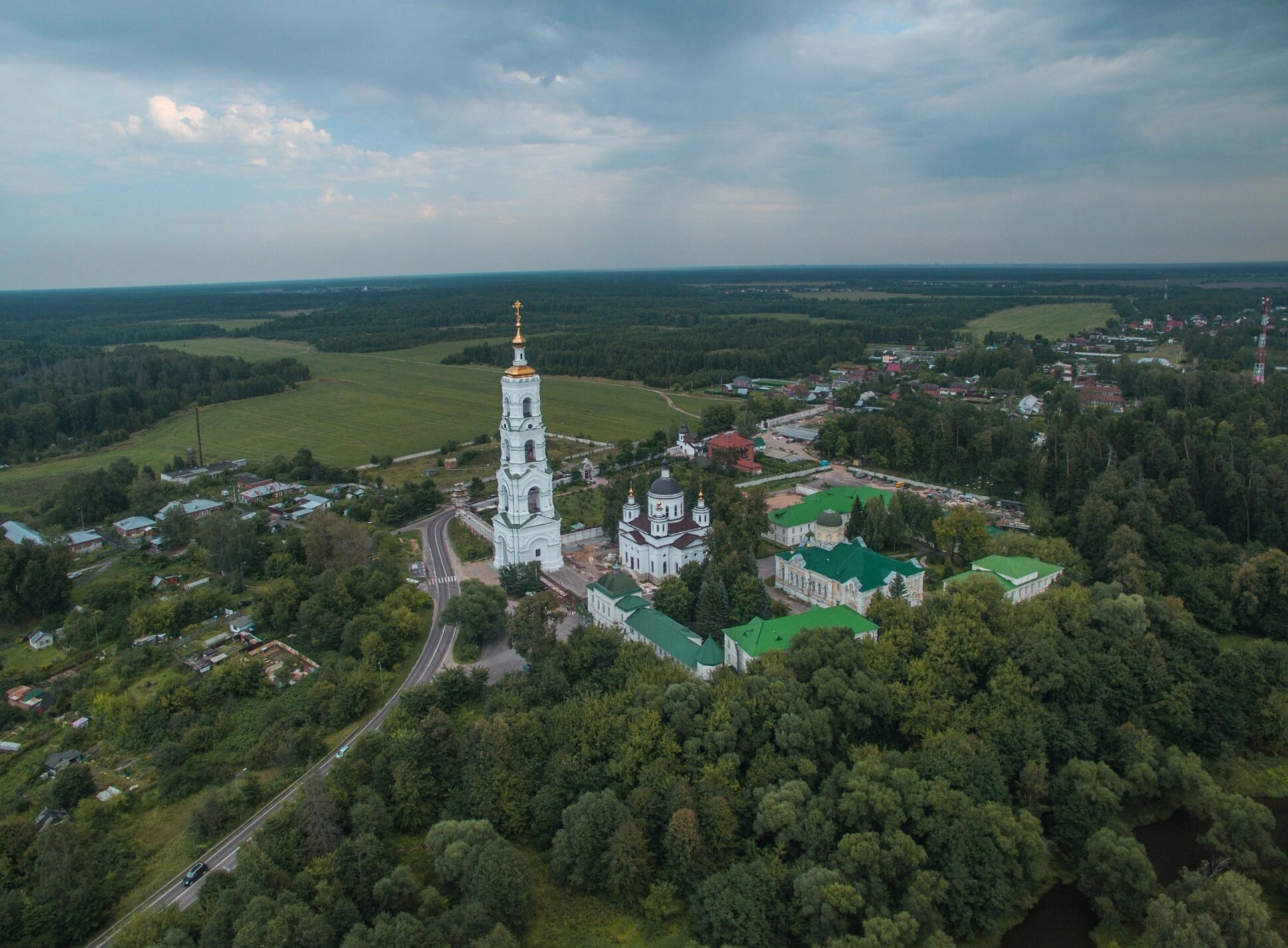 На представленной фотографии запечатлён общий вид священной Николо-Берлюковской пустыни — мужского монастыря, расположенного на левом берегу реки Вори, близ деревни Авдотьино Богородского городского округа Московской области. Снимок, сделанный с высоты, открывает панораму всей монастырской территории, окружённой густыми лесами и полями. Центром композиции служит величественная многоярусная колокольня белого цвета с золочёным куполом и крестом, возведённая в конце XIX века. Рядом с ней видны другие строения обители: храмы, игуменские кельи и хозяйственные постройки, характерные для традиционного русского церковного зодчества с белыми оштукатуренными стенами и зелёными металлическими кровлями. На переднем плане справа заметна гладь реки Вори, а небо, затянутое облаками, создаёт мягкое, рассеянное освещение, подчёркивающее умиротворённость места.