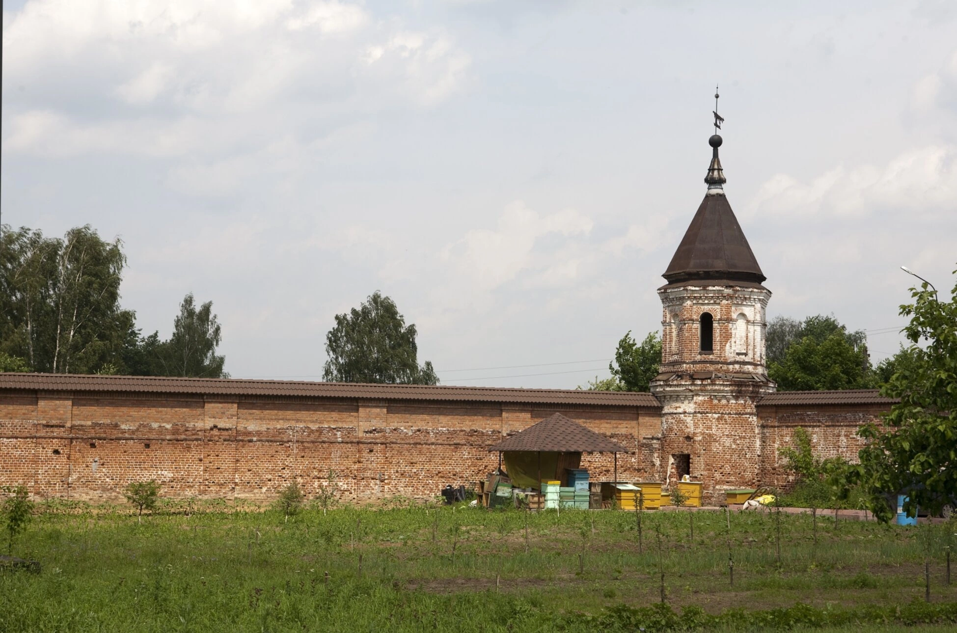 На переднем плане изображена массивная кирпичная стена монастырской ограды, сложенная из красного кирпича. В верхней части стены заметны элементы охранного назначения. К стене примыкает башня, выполненная в едином архитектурном стиле с основными строениями монастыря. Башня демонстрирует характерные признаки православной храмовой архитектуры с арочными оконными проемами и коническим завершением, увенчанным небольшим шпилем.